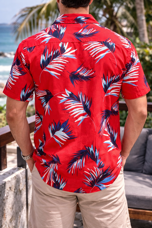Camisa Manga Corta Roja Hojas Azules OVERSIZE