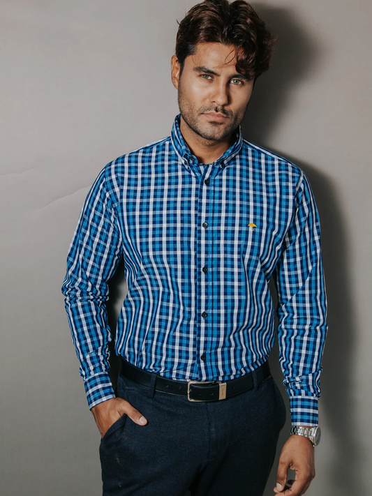CAMISA CASUAL HOMBRE ,CUADRO AZUL CIELO Y GRIS
