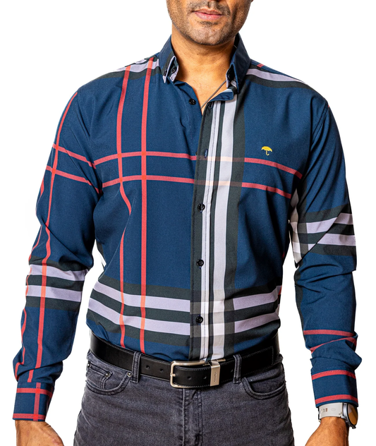 CAMISA CASUAL HOMBRE, AZUL MARINO LÍNEAS ROJA Y BEIGE