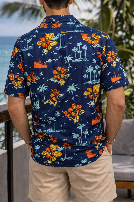 Camisa Manga Corta Azul Palmeras y Flores OVERSIZE