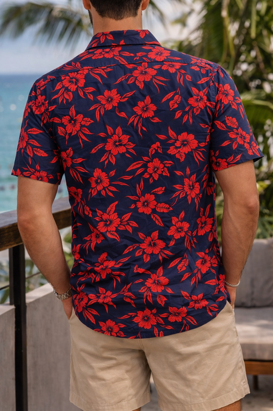 Camisa Manga Corta Azul Flores Rojas OVERSIZE