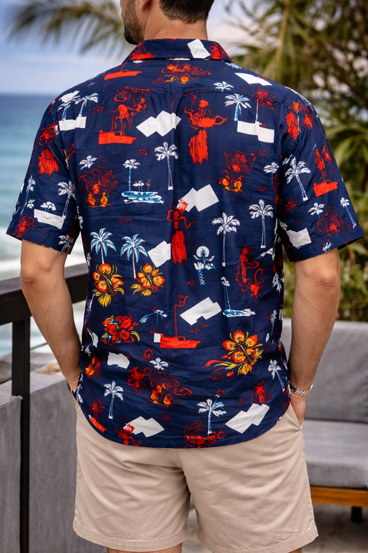 Camisa Manga Corta Roja Hojas Azules OVERSIZE
