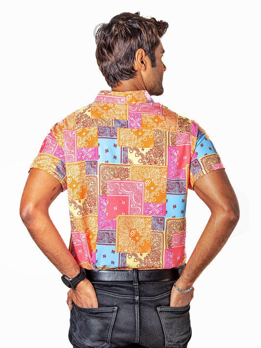 CAMISA HOMBRE CASUAL MANGA CORTA CUADROS NARANJAS, ROSAS FLOREADA BANDANA