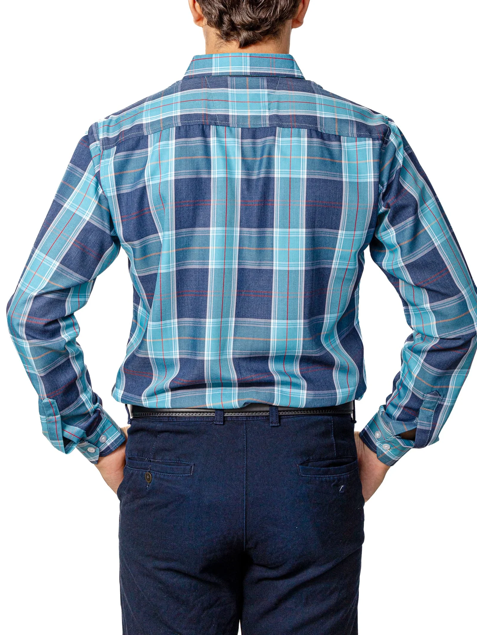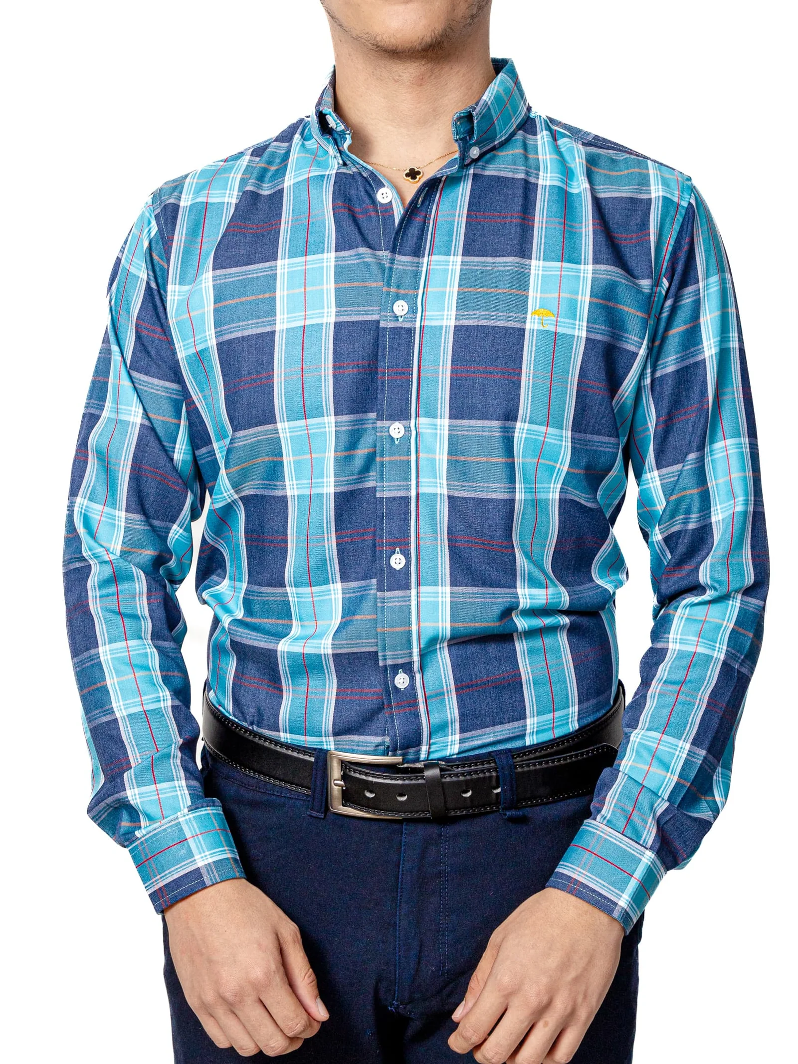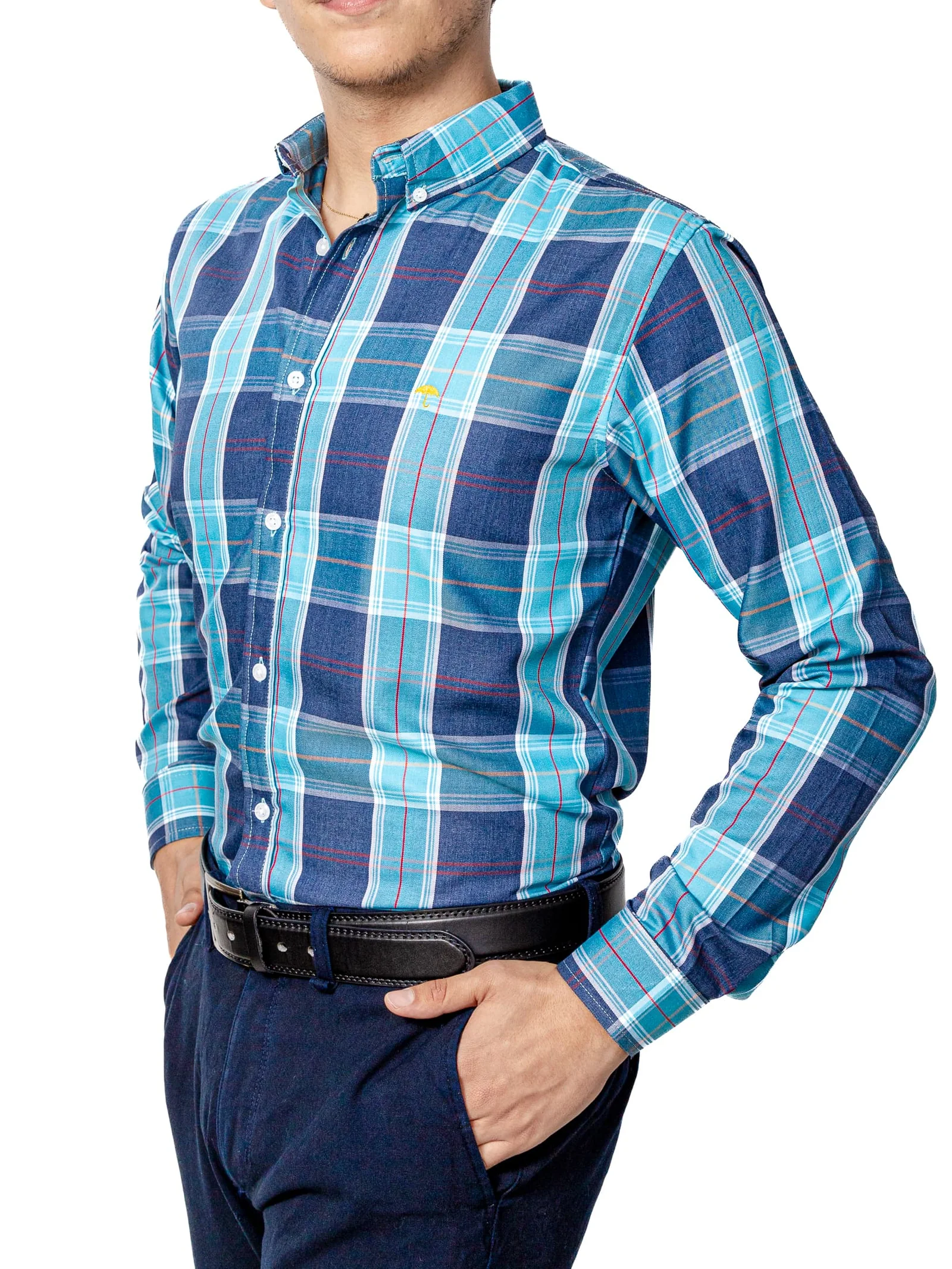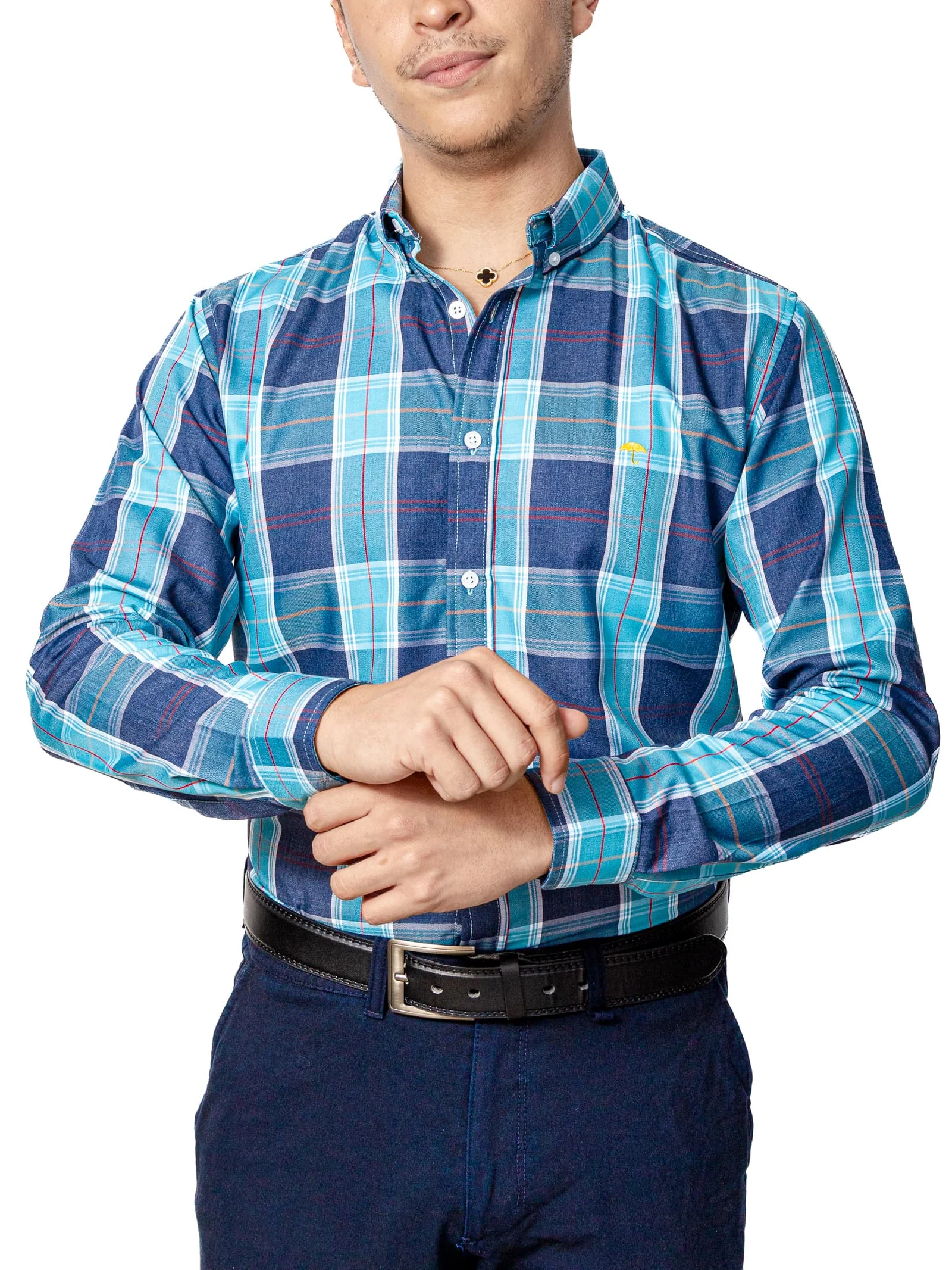 CAMISA CASUAL HOMBRE,CUADROS AZUL TURQUESA LINEA ROJA