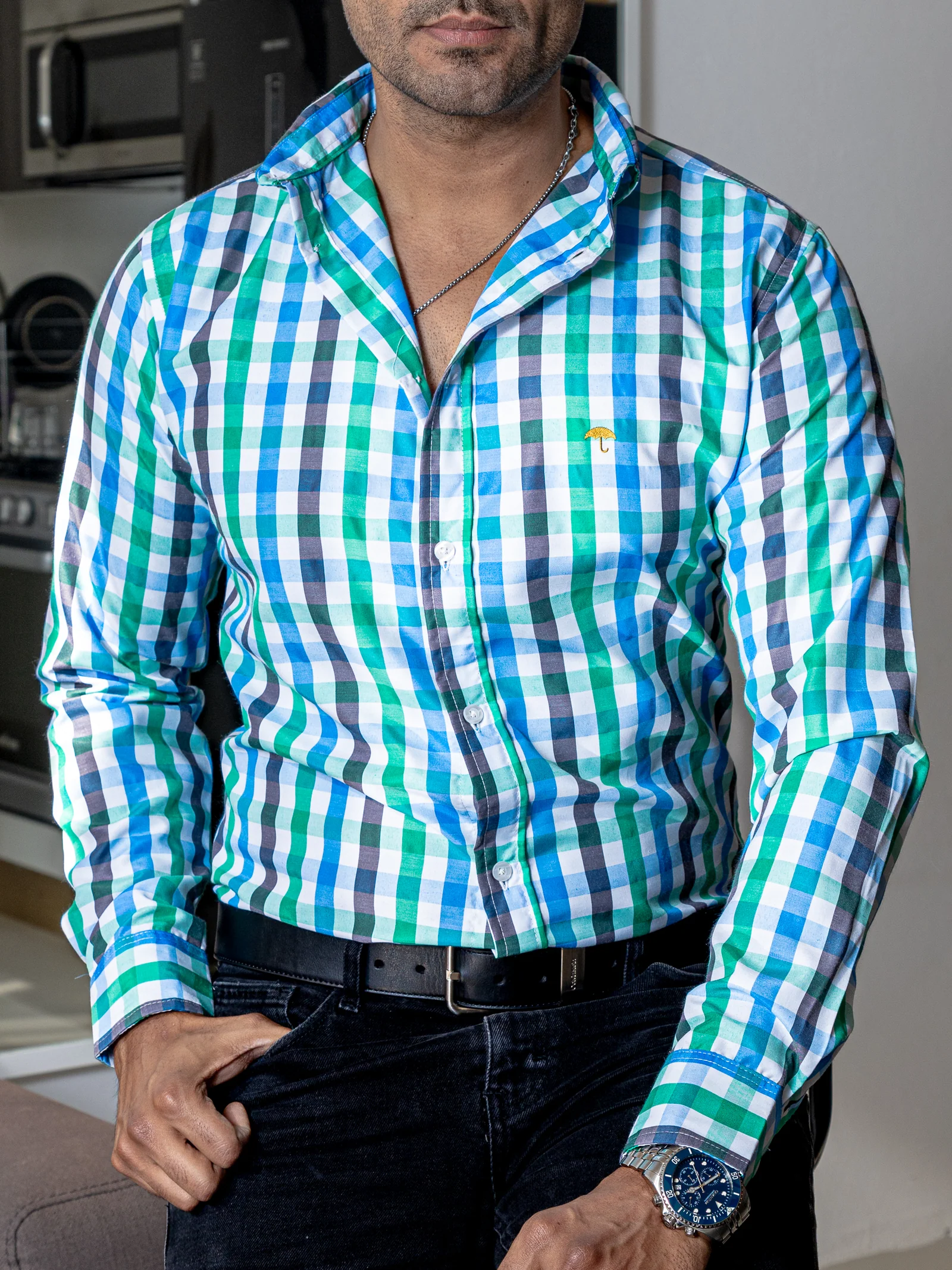 CAMISA CASUAL HOMBRE, FRANJAS VERDE, GRIS Y AZUL