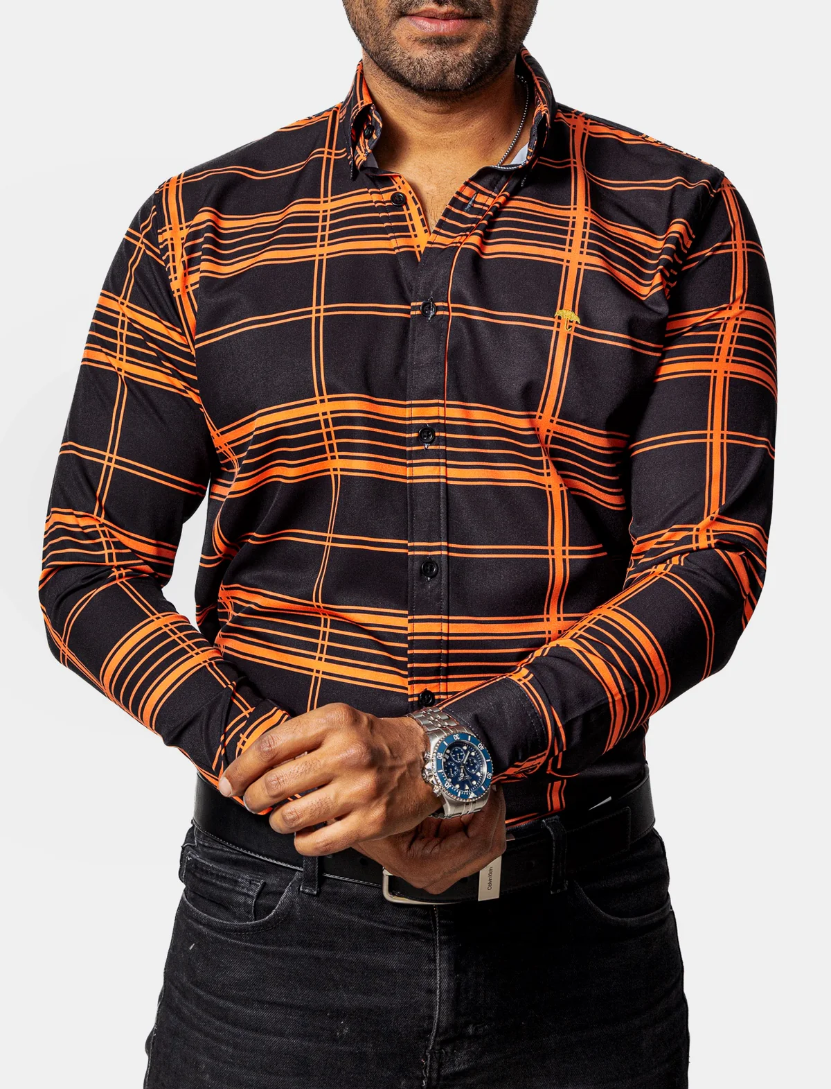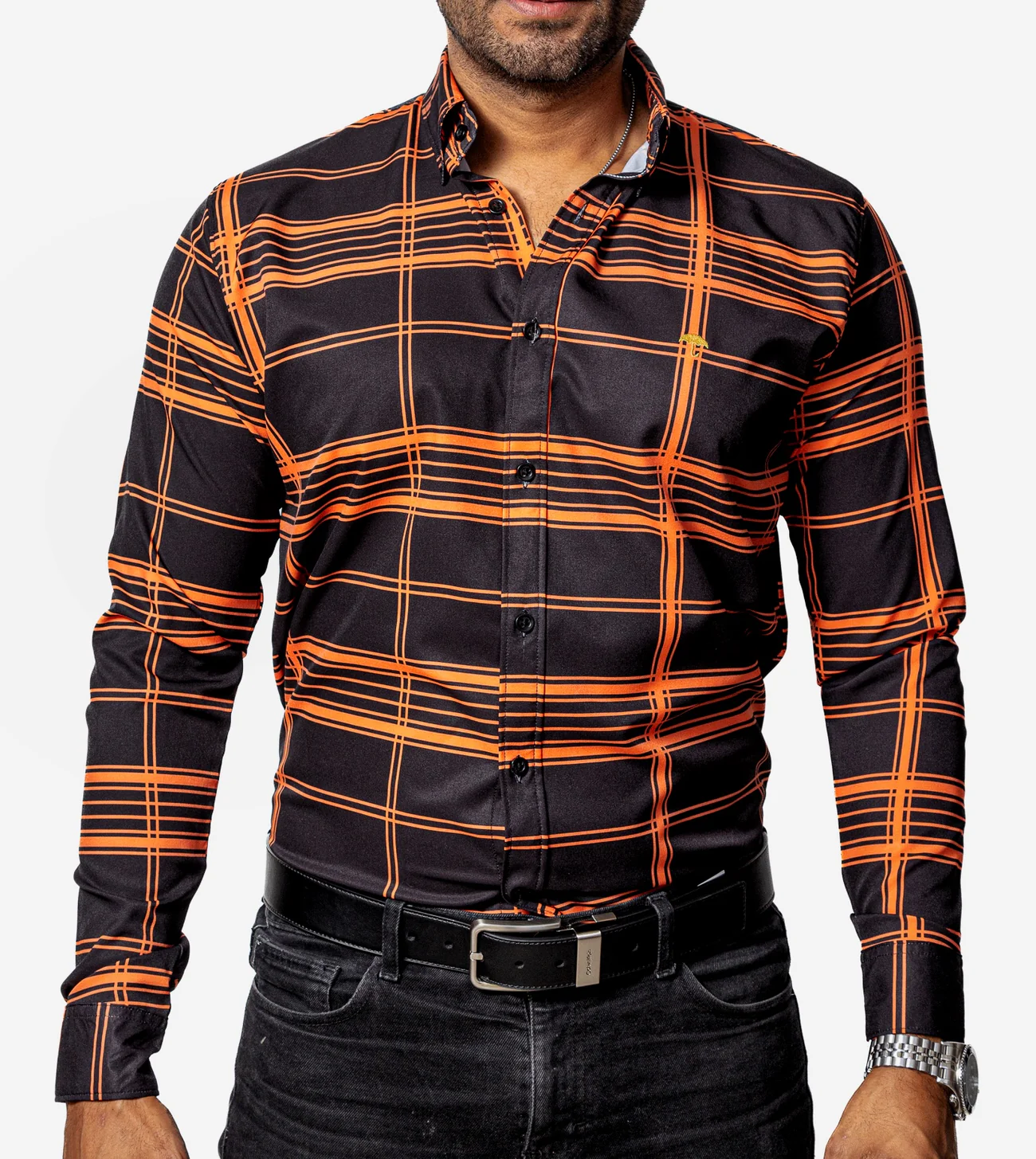 CAMISA CASUAL HOMBRE, NEGRA LÍNEAS NARANJA