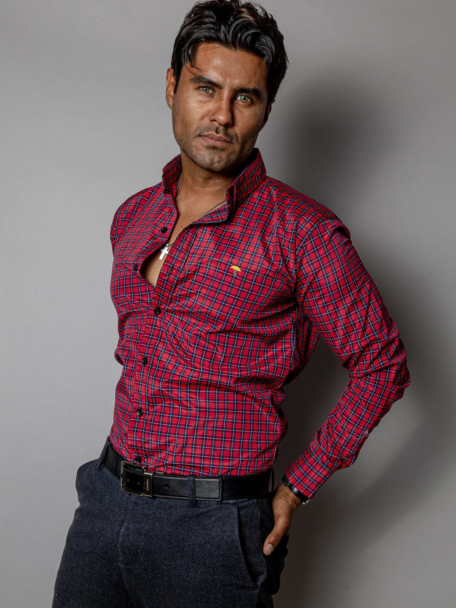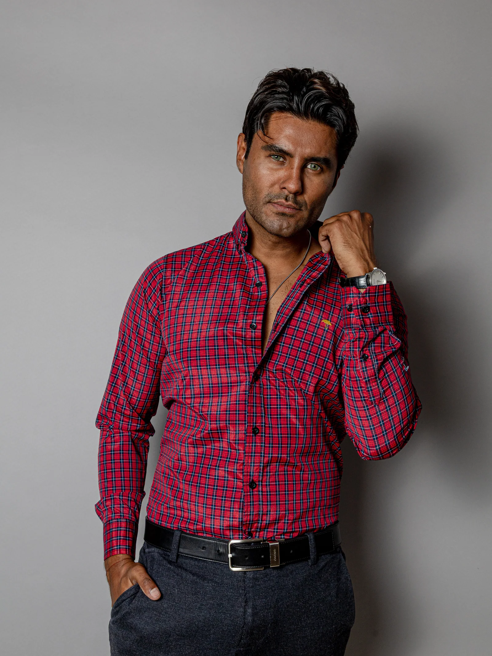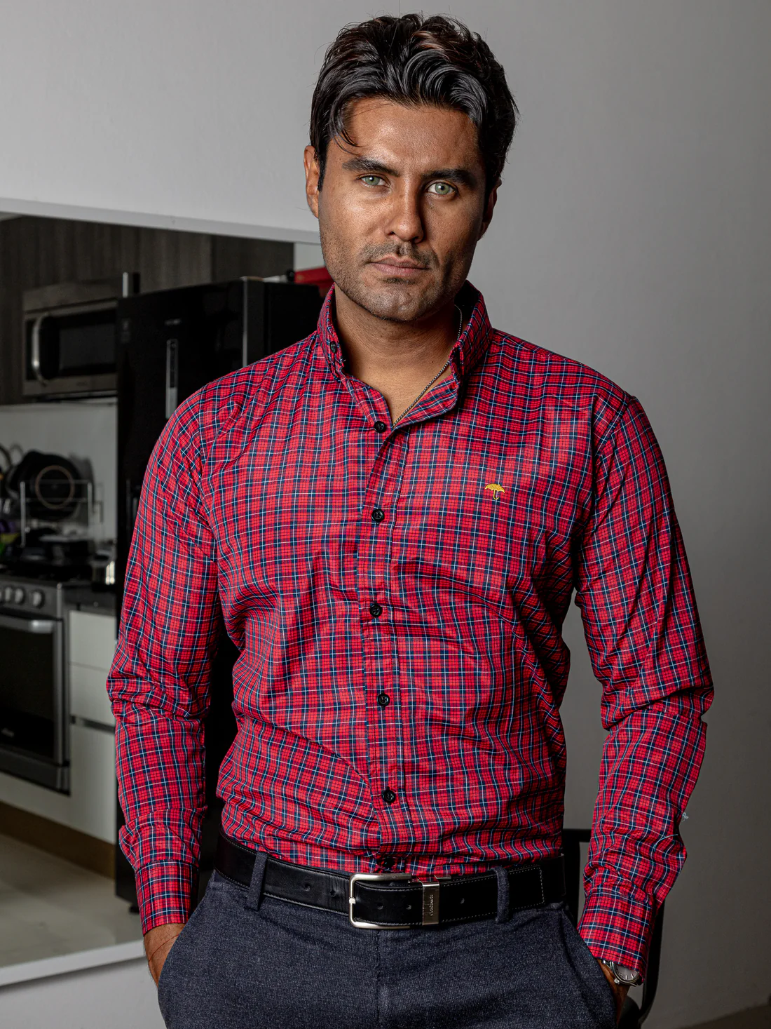 CAMISA CASUAL HOMBRE,ROJA MICROCUADRO AZUL MARINO