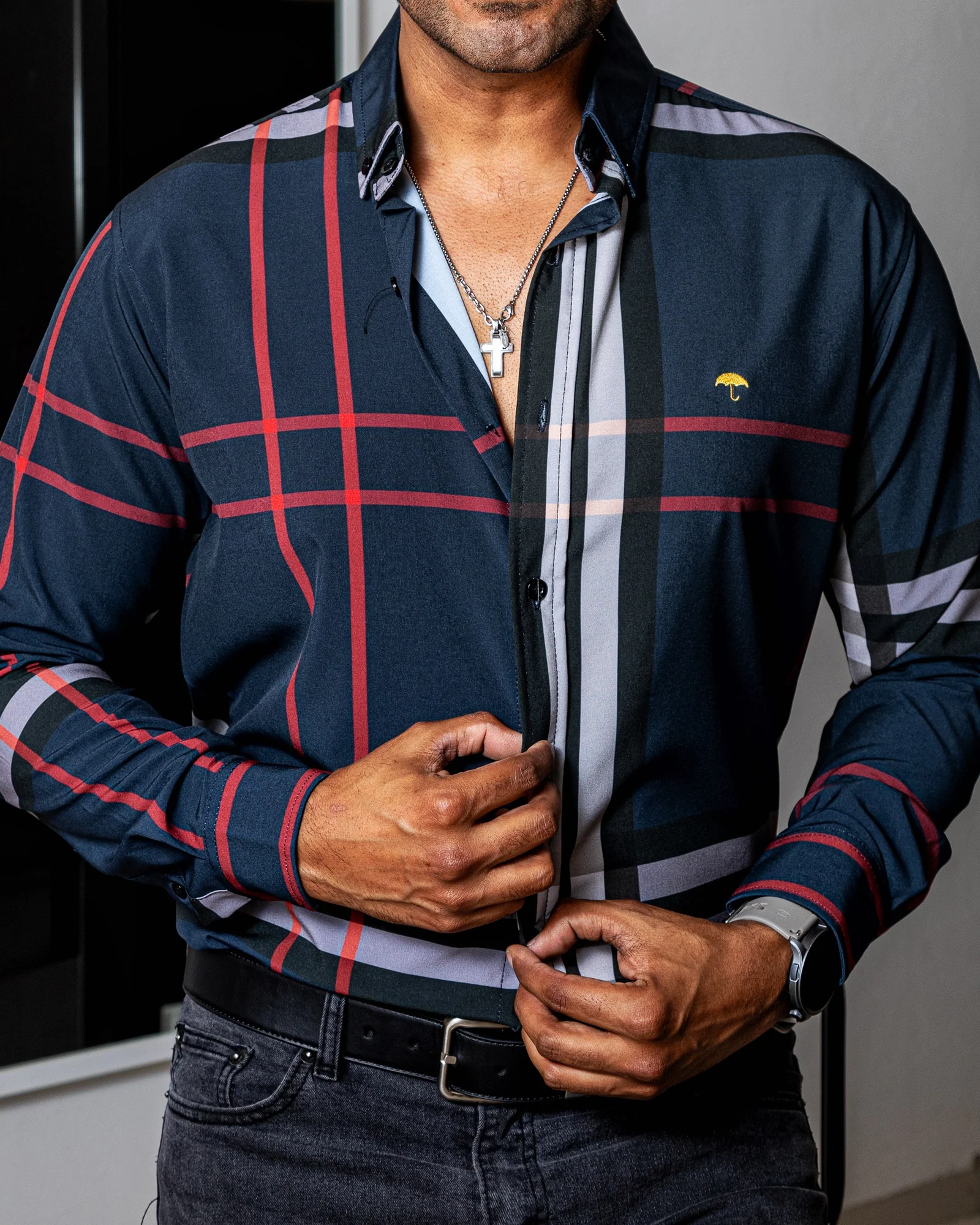 CAMISA CASUAL HOMBRE SLIM, AZUL LÍNEAS ROJA, NEGRA Y GRIS