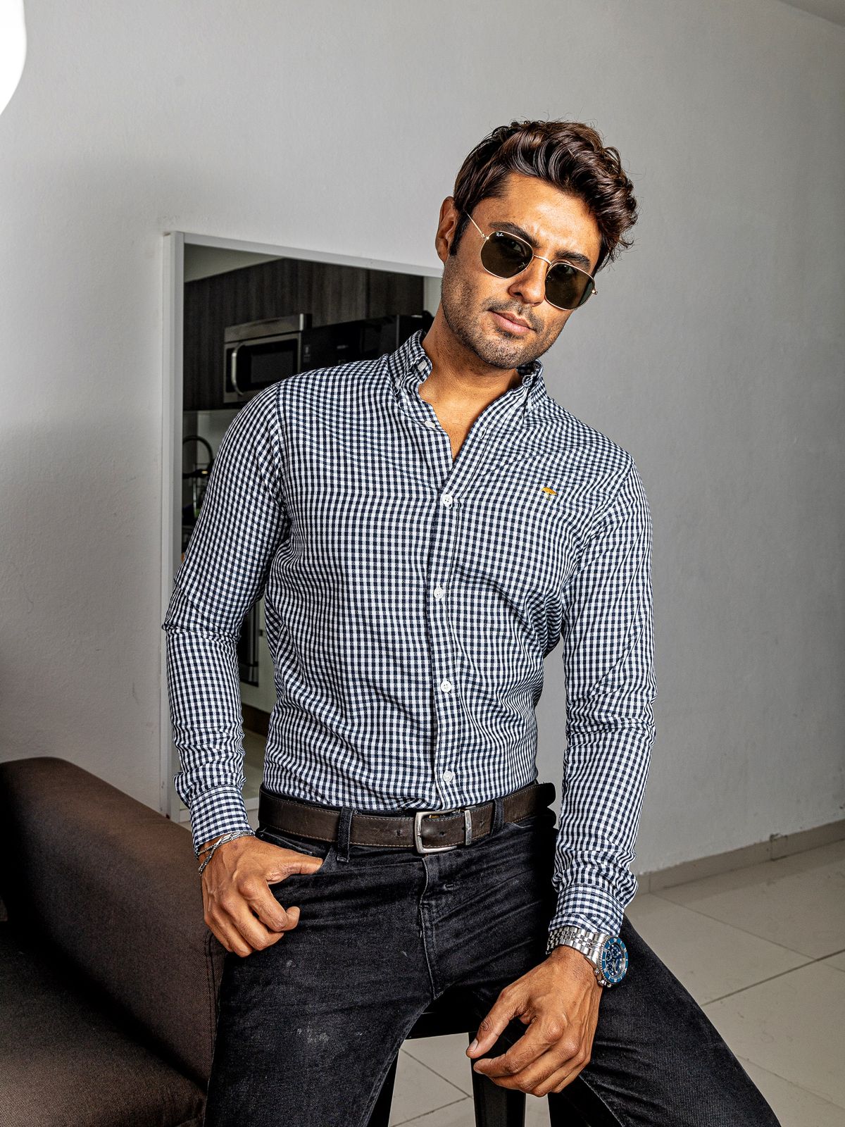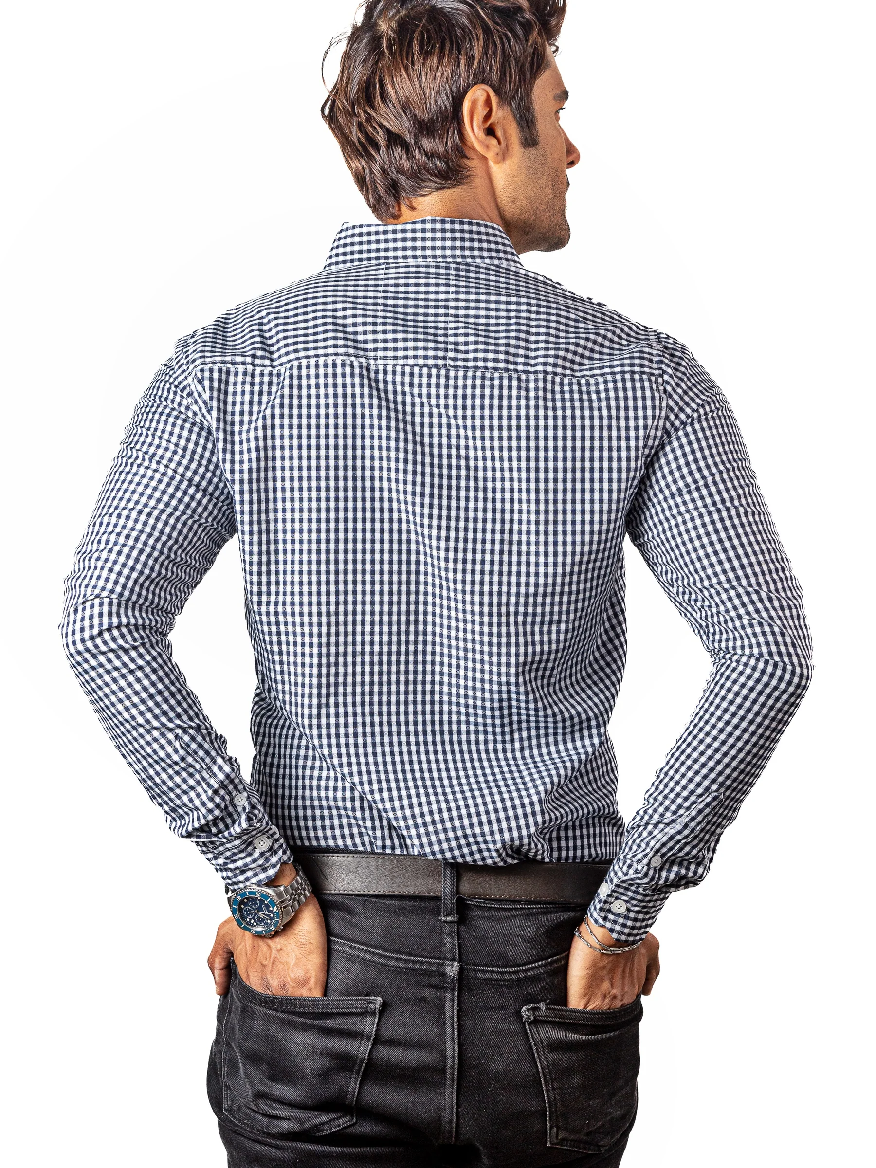 CAMISA HOMBRE CASUAL REGULAR FIT MINI CUADROS NEGROS, BLANCOS