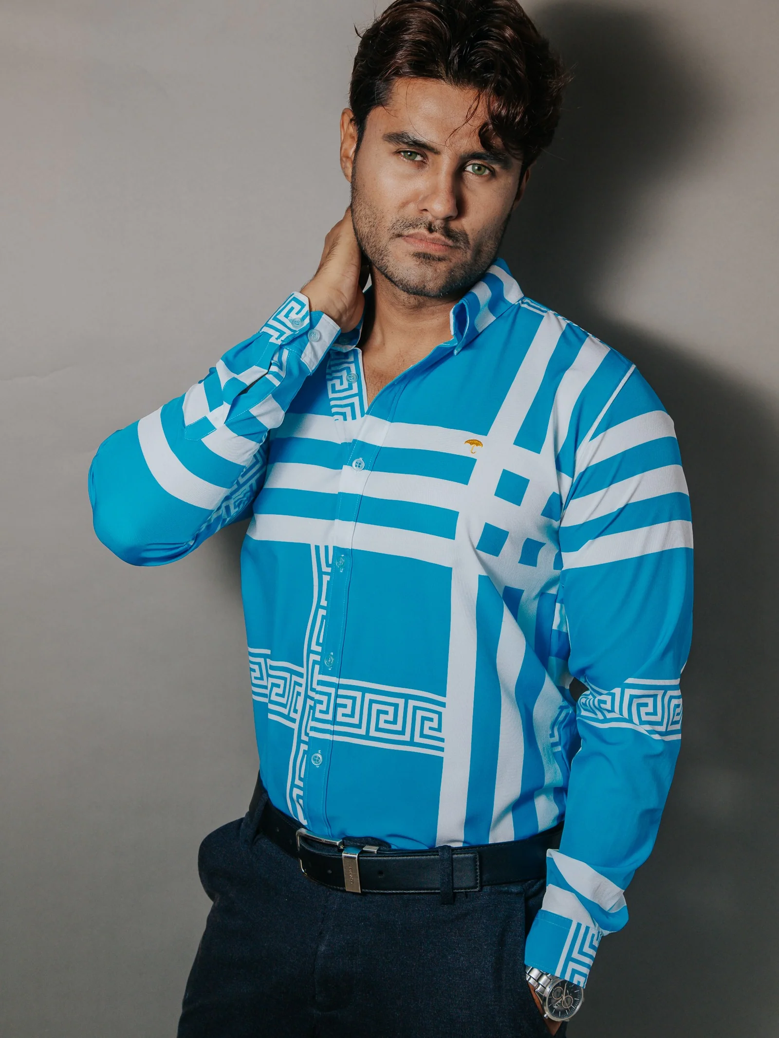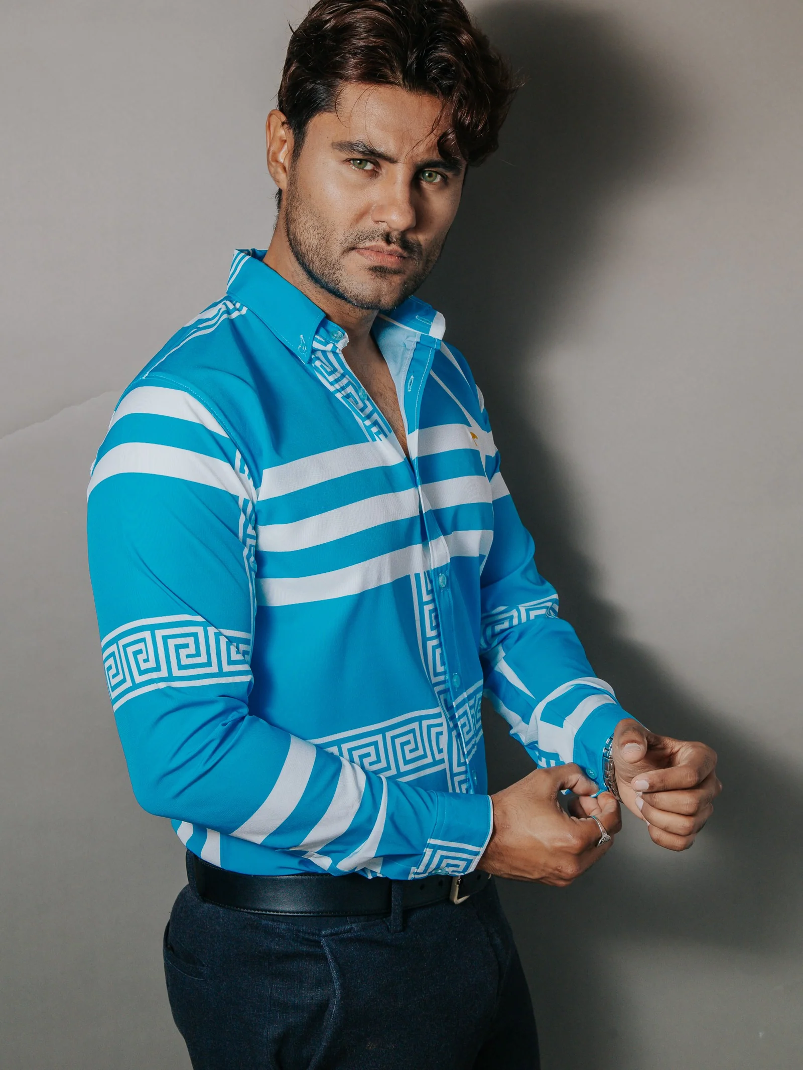 CAMISA HOMBRE SLIM FIT, AZUL CIELO DETALLE GRIEGO BLANCO