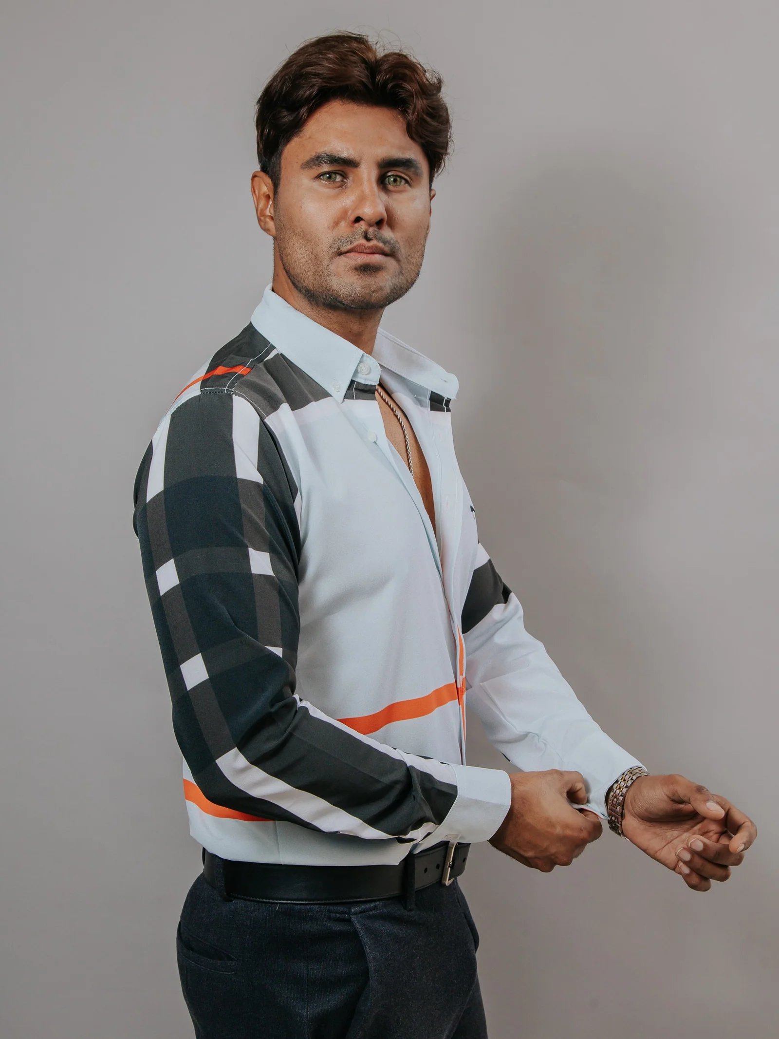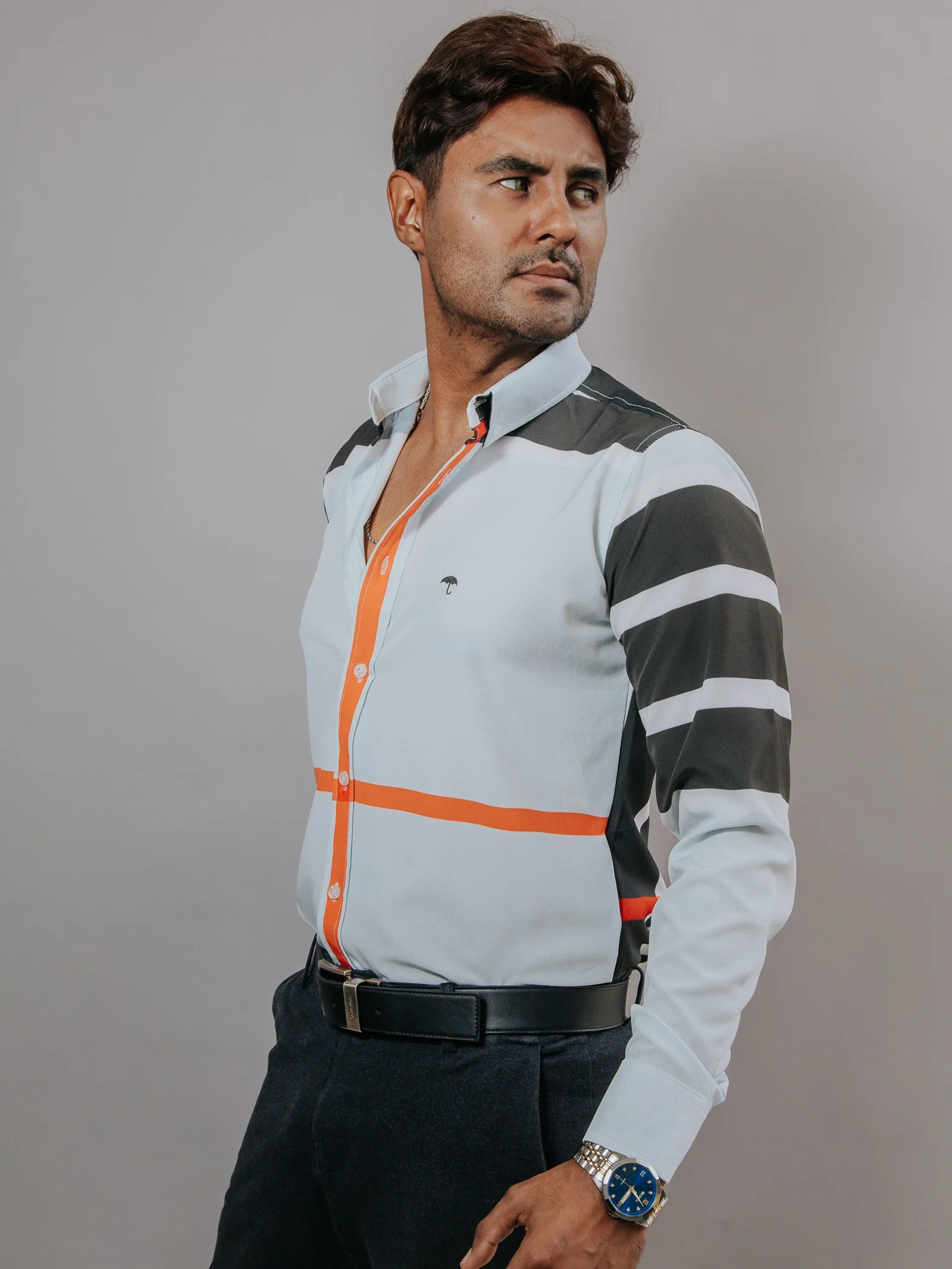 CAMISA HOMBRE SLIM FIT, AZUL CLARO LÍNEAS NEGRO Y NARANJA
