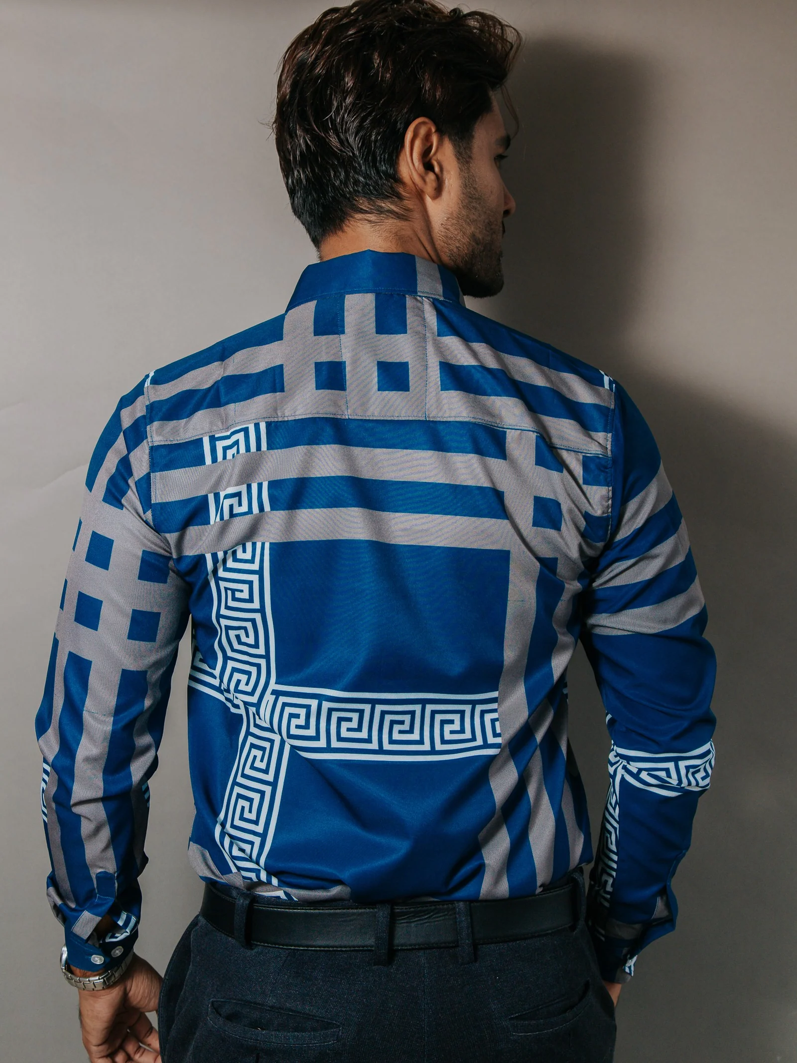 CAMISA HOMBRE SLIM FIT AZUL DETALLE GRIEGO BLANCO LÍNEAS GRIS