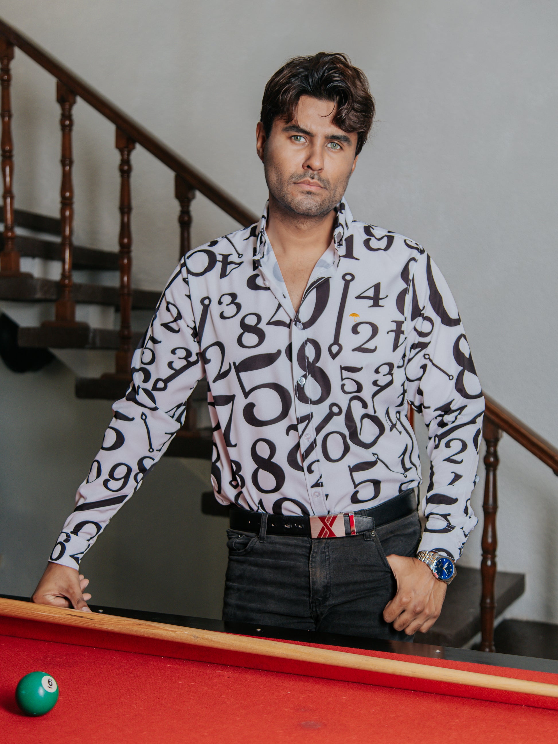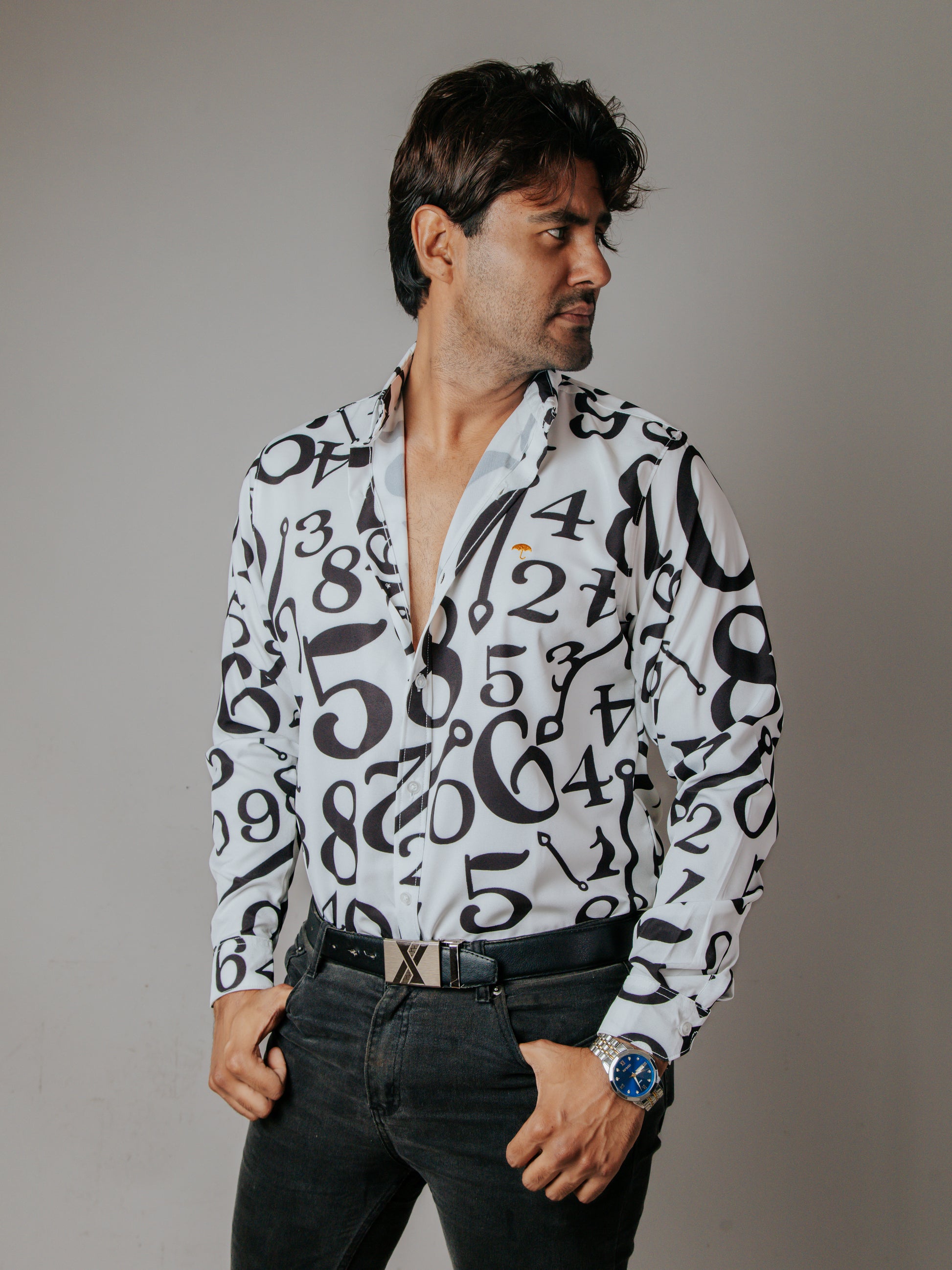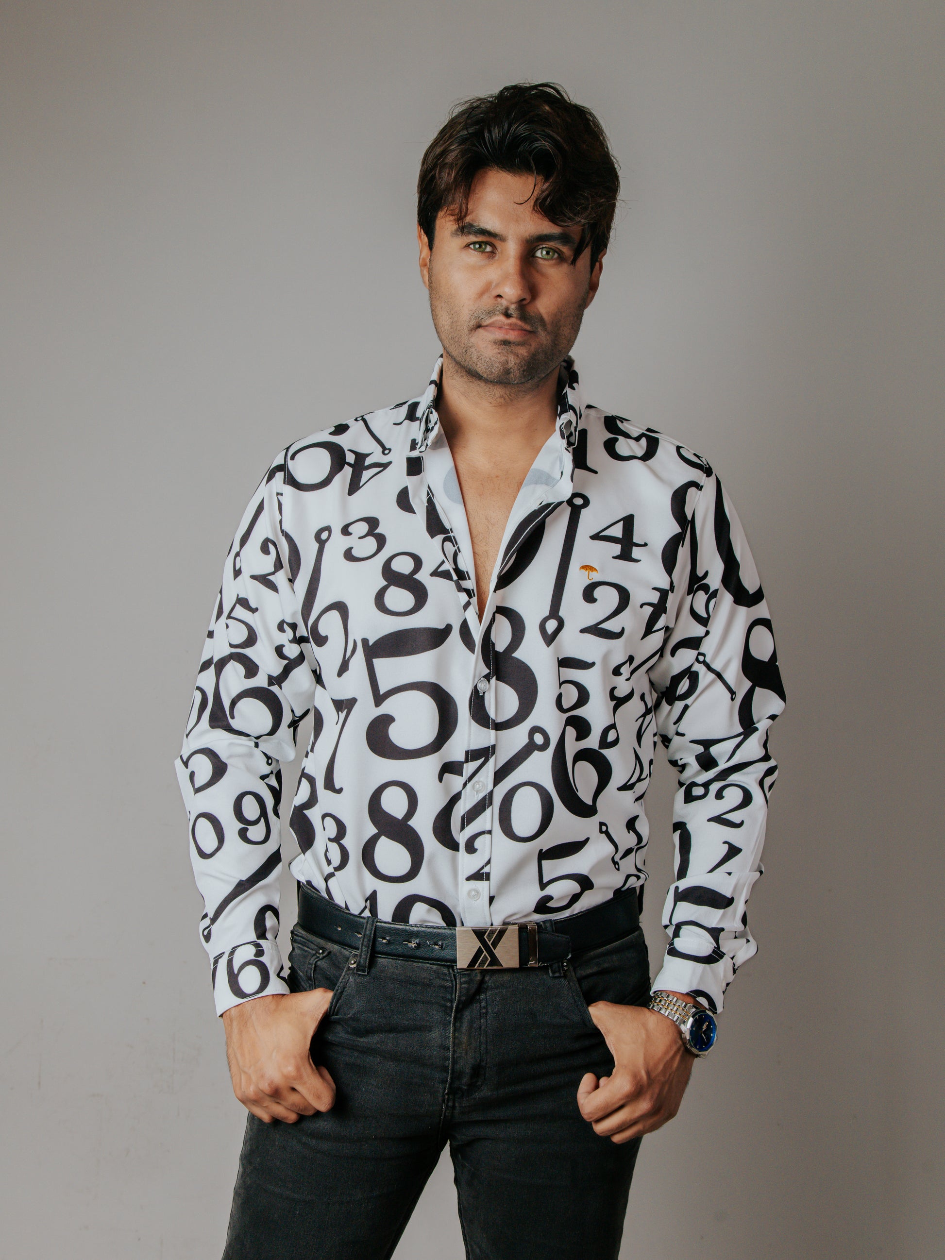 CAMISA HOMBRE SLIM FIT, BLANCA CON NUMEROS AZULES