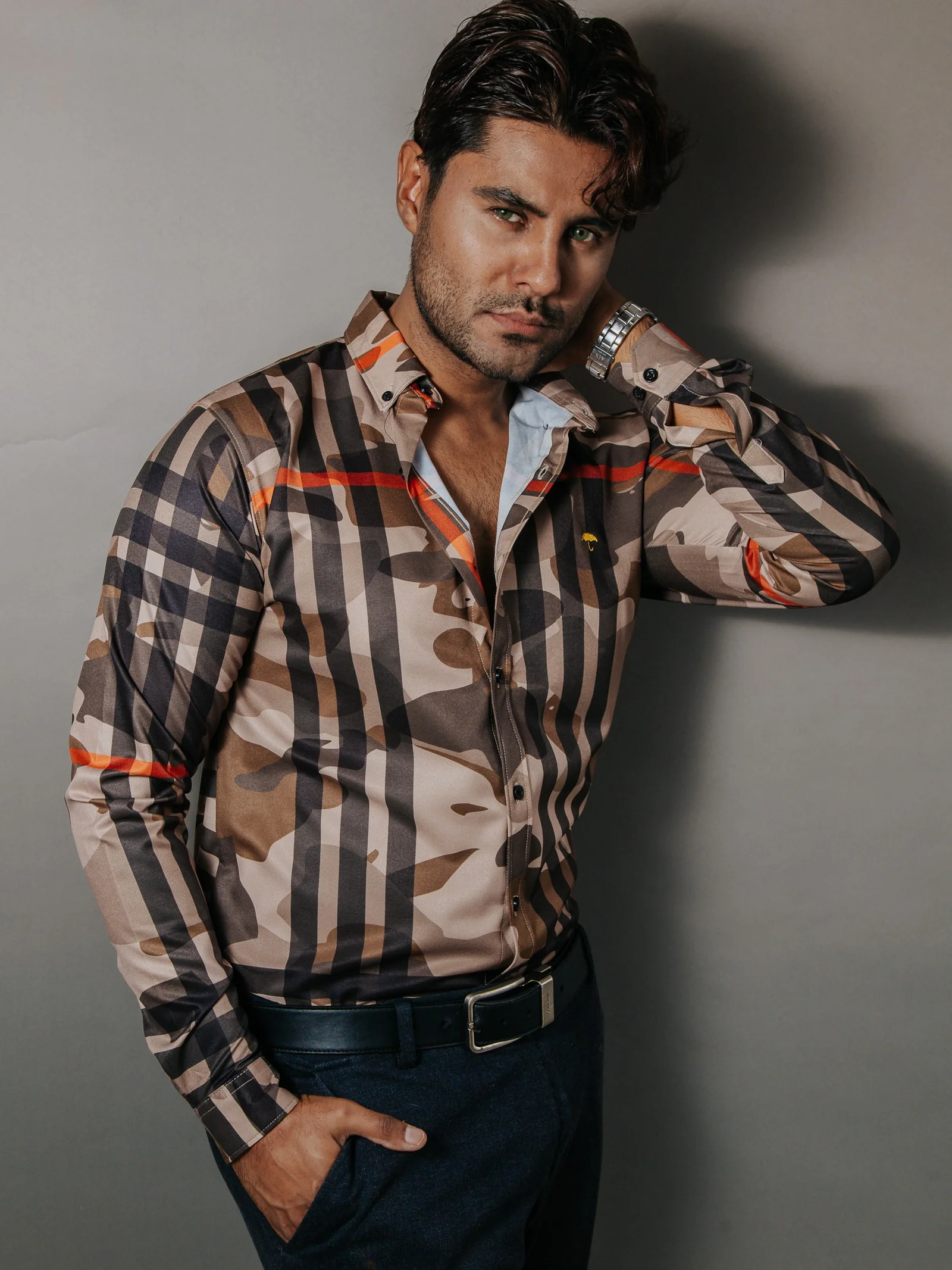 CAMISA HOMBRE SLIM FIT CAMUFLAJE LÍNEA NARANJA