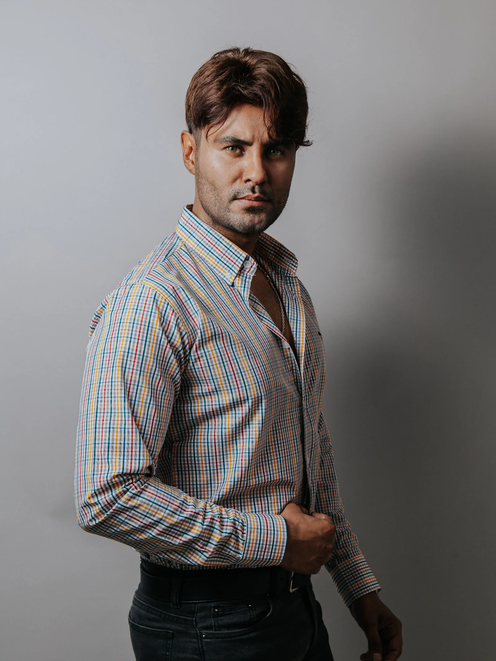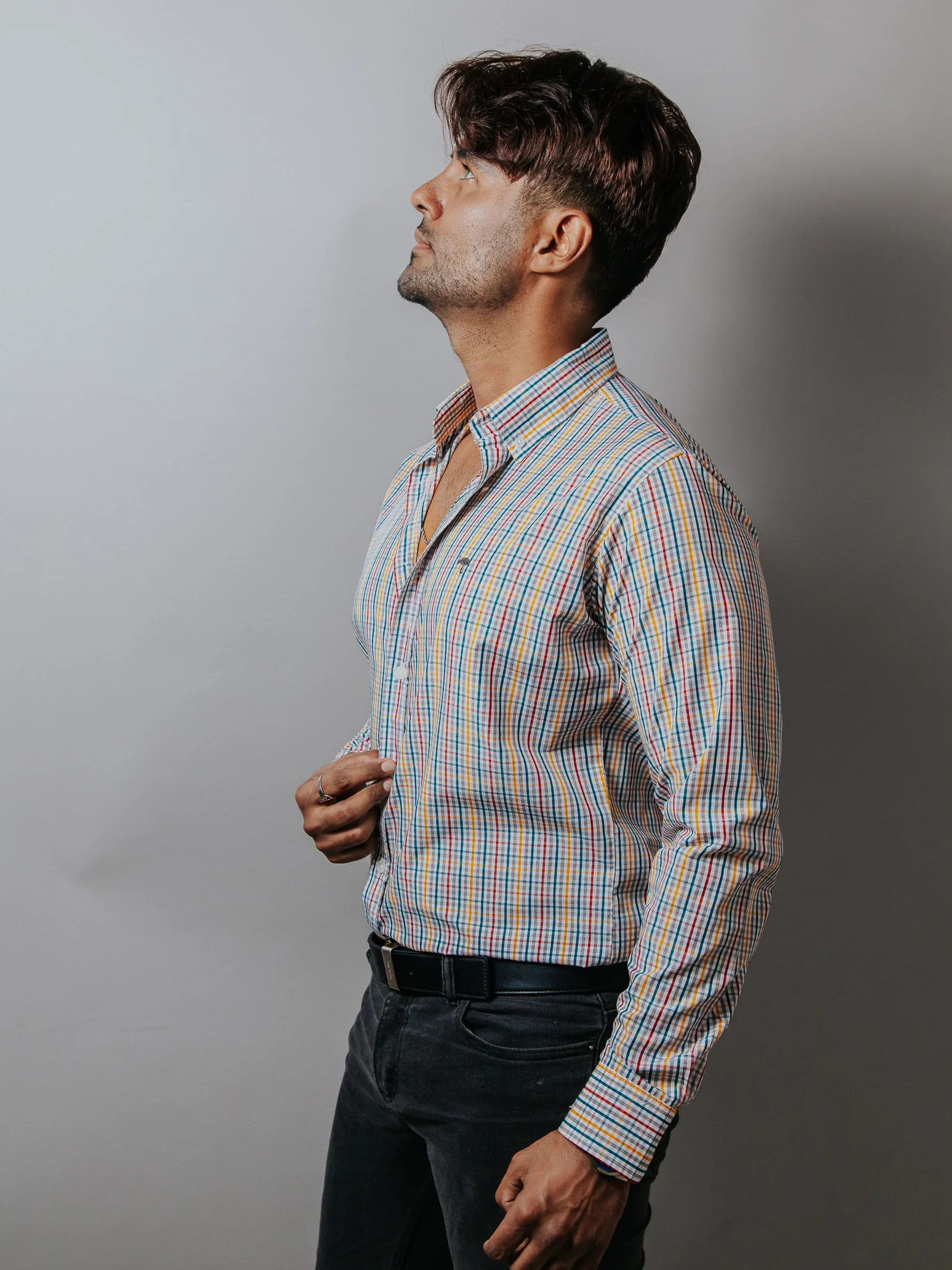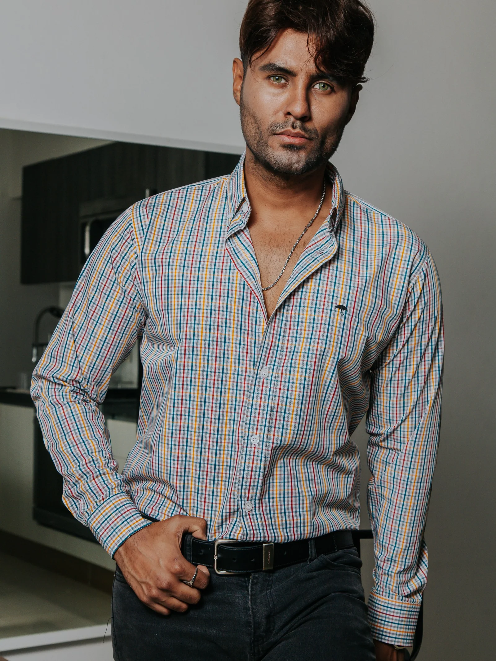 CAMISA HOMBRE SLIM FIT, CUADROS GRIS, AZUL, ROJO, AMARILLOS
