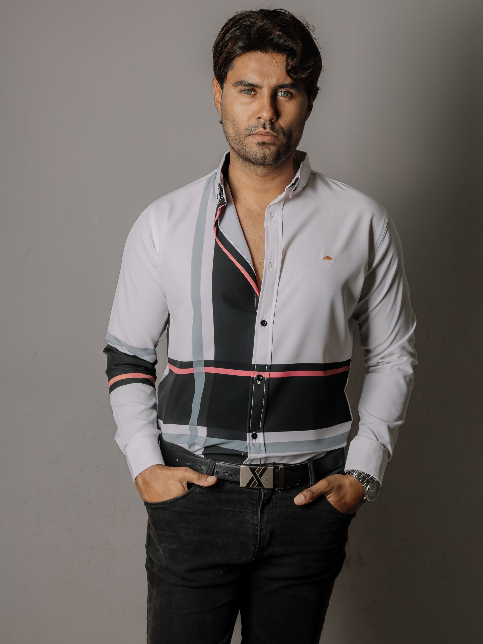 CAMISA HOMBRE SLIM FIT, LÍNEAS NEGRA, GRIS Y ROSA