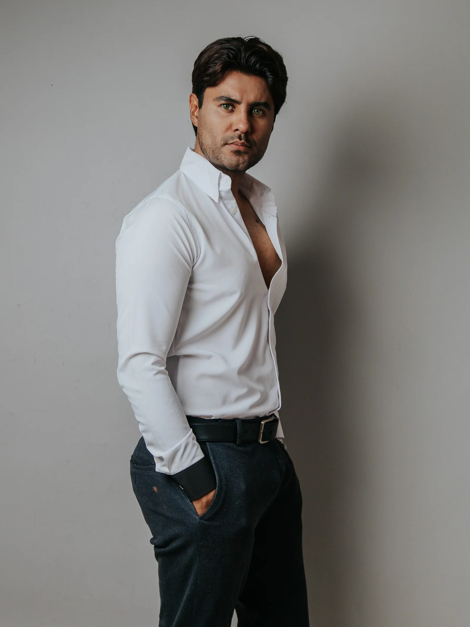 CAMISA HOMBRE SLIM FIT, LISA BLANCA MANGA NEGRA