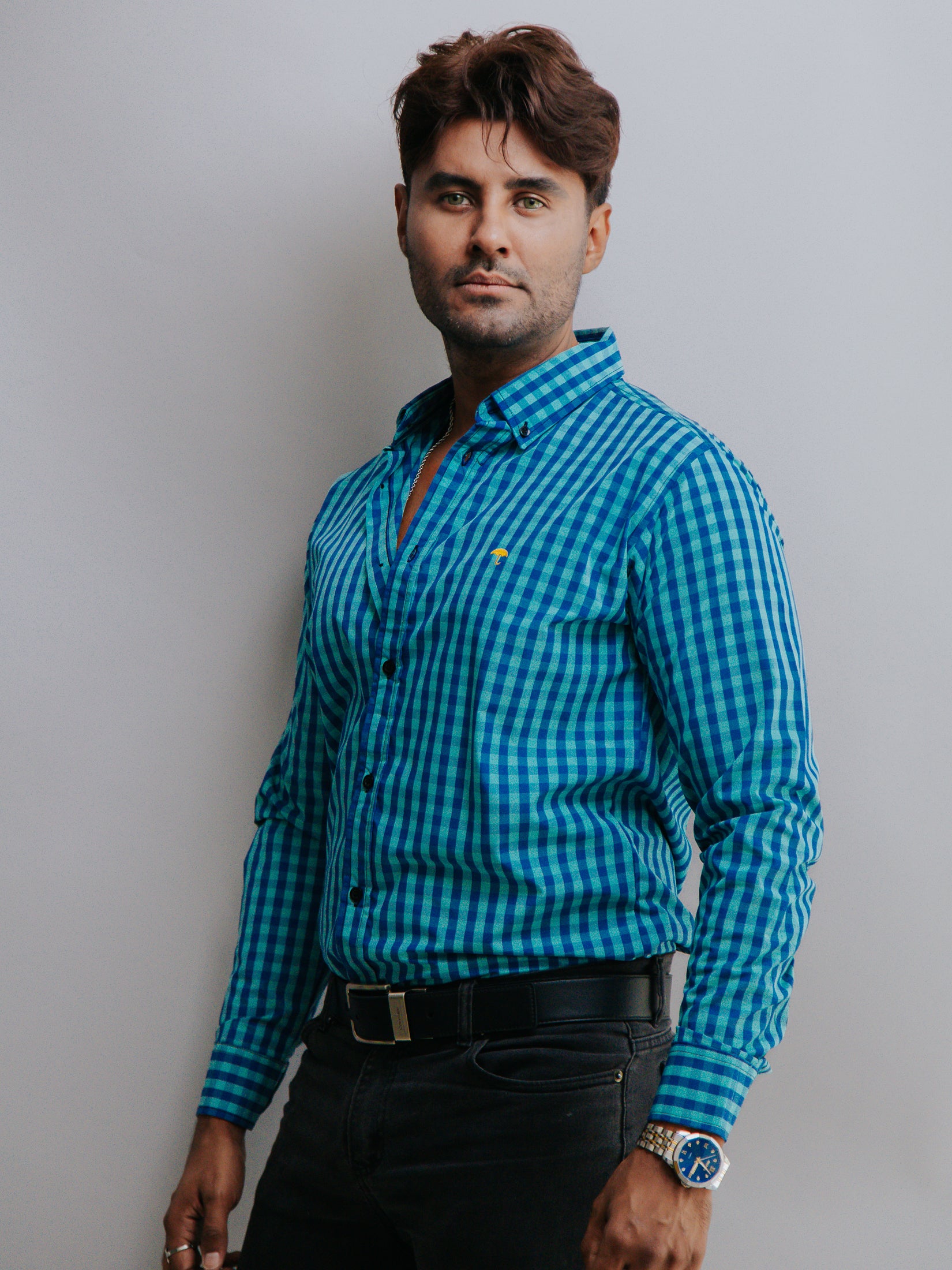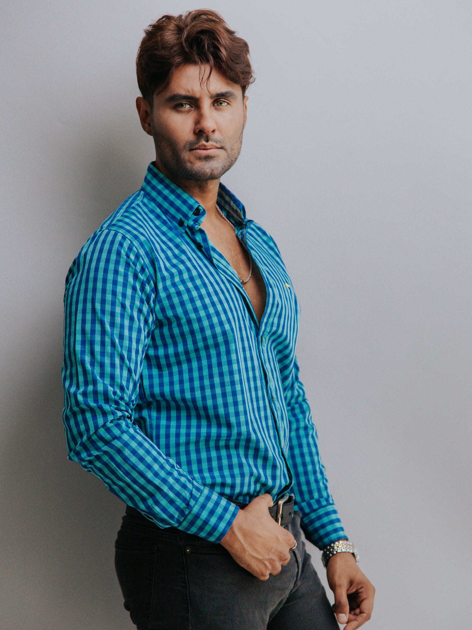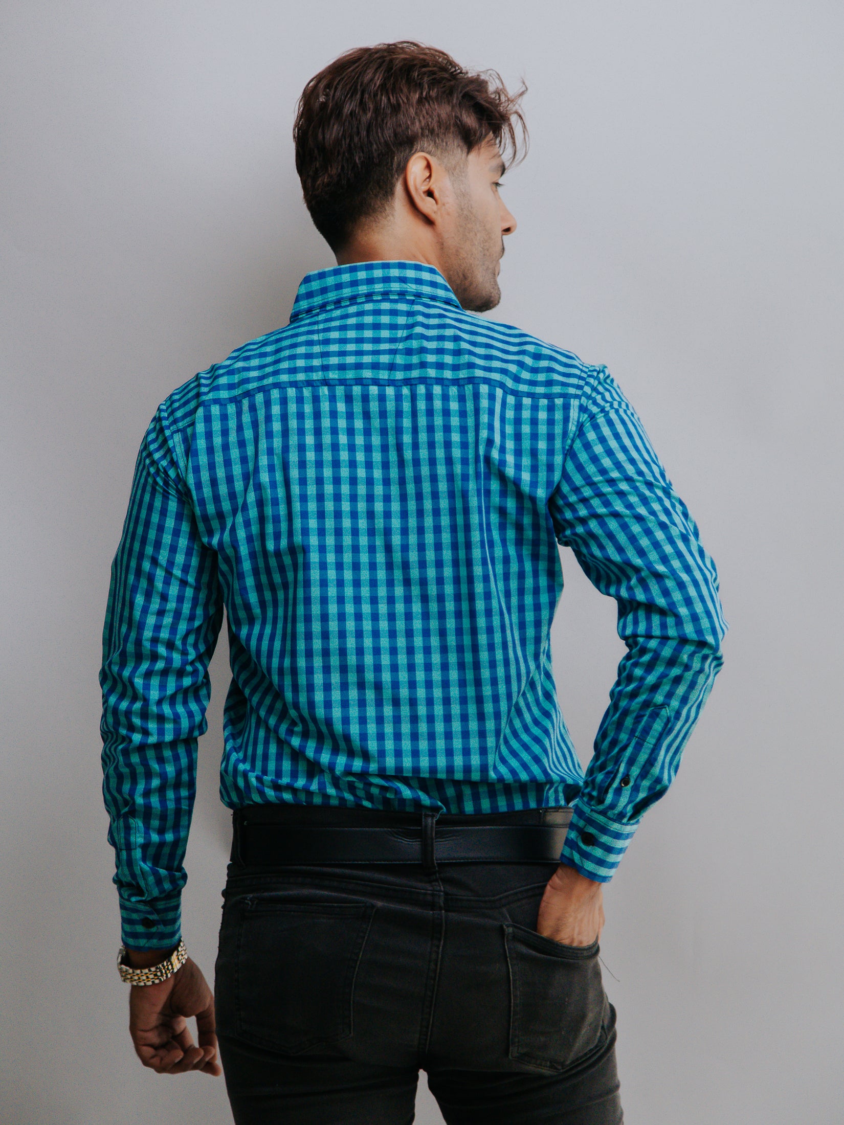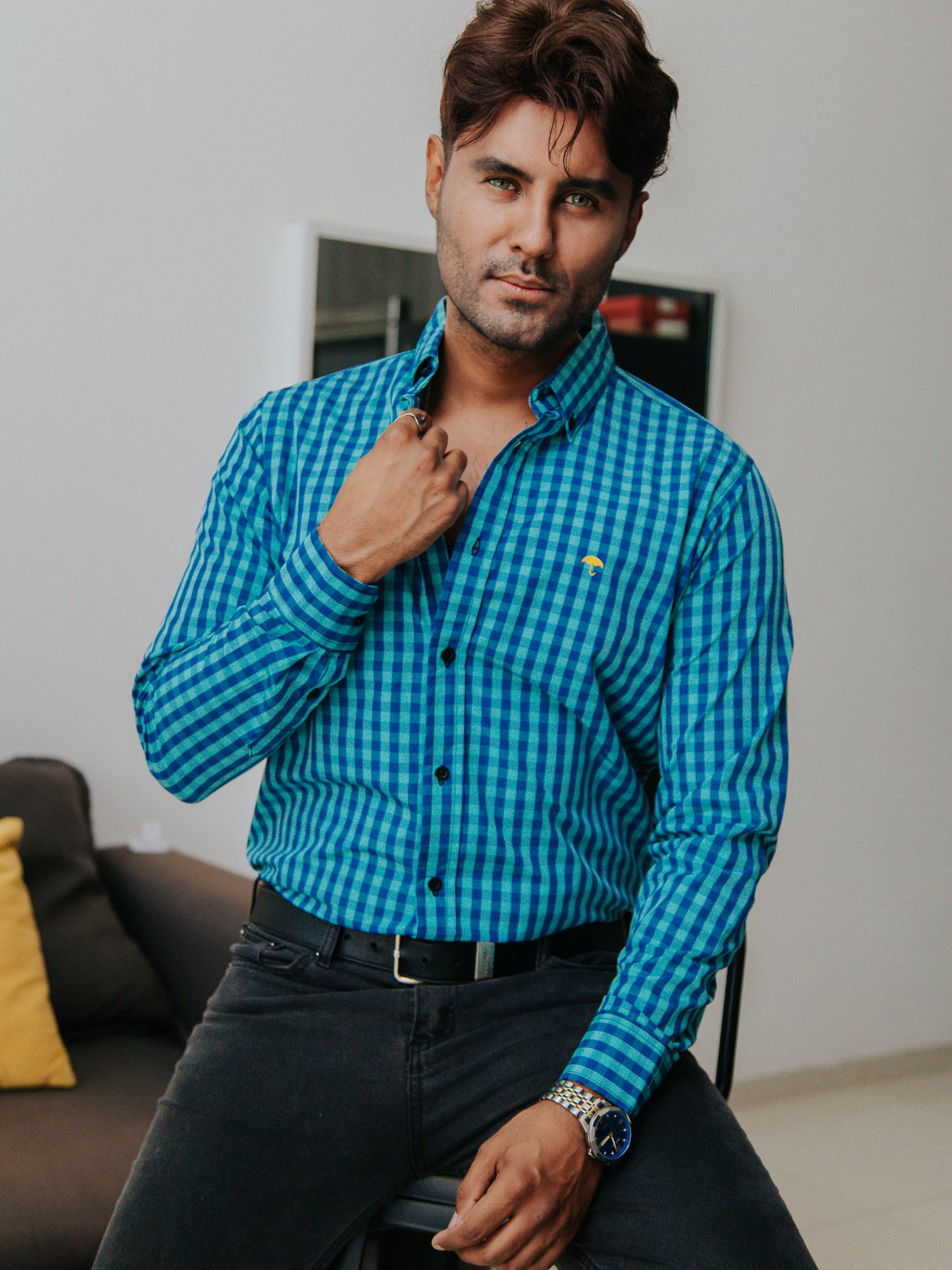 CAMISA HOMBRE SLIM FIT, MINI CUADROS VERDE Y AZUL
