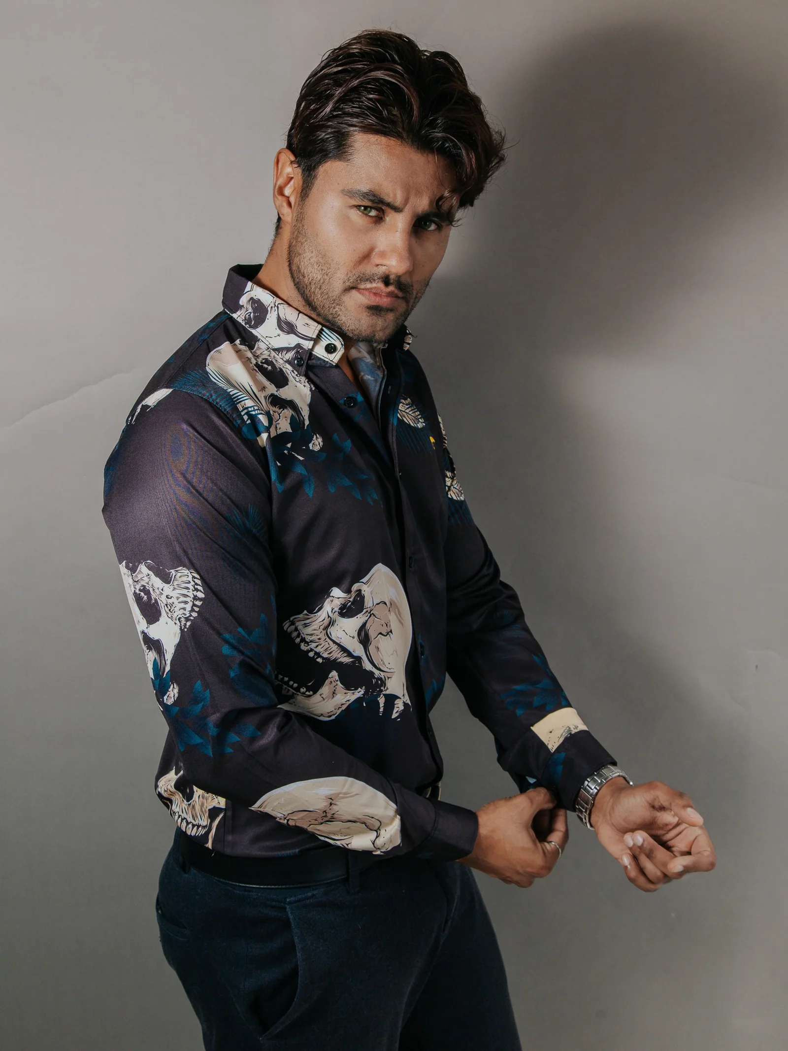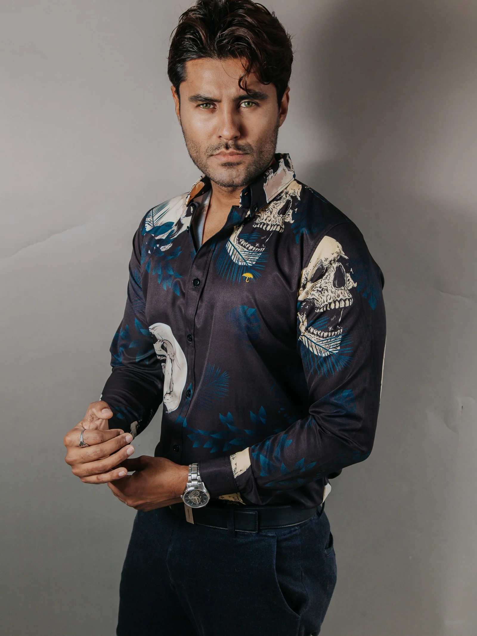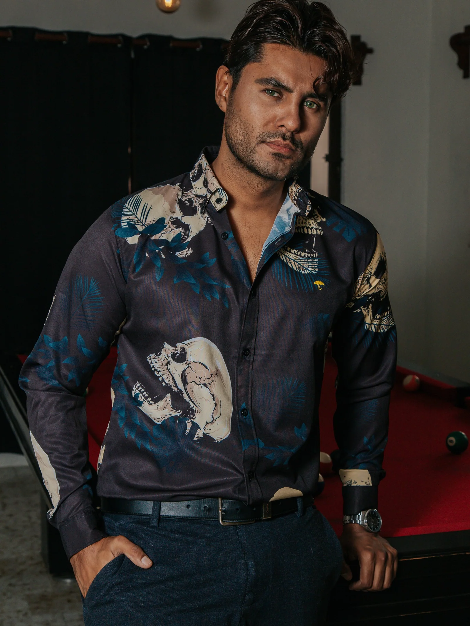 CAMISA HOMBRE SLIM FIT NEGRO CALAVERA BEIGE HOJAS AZUL