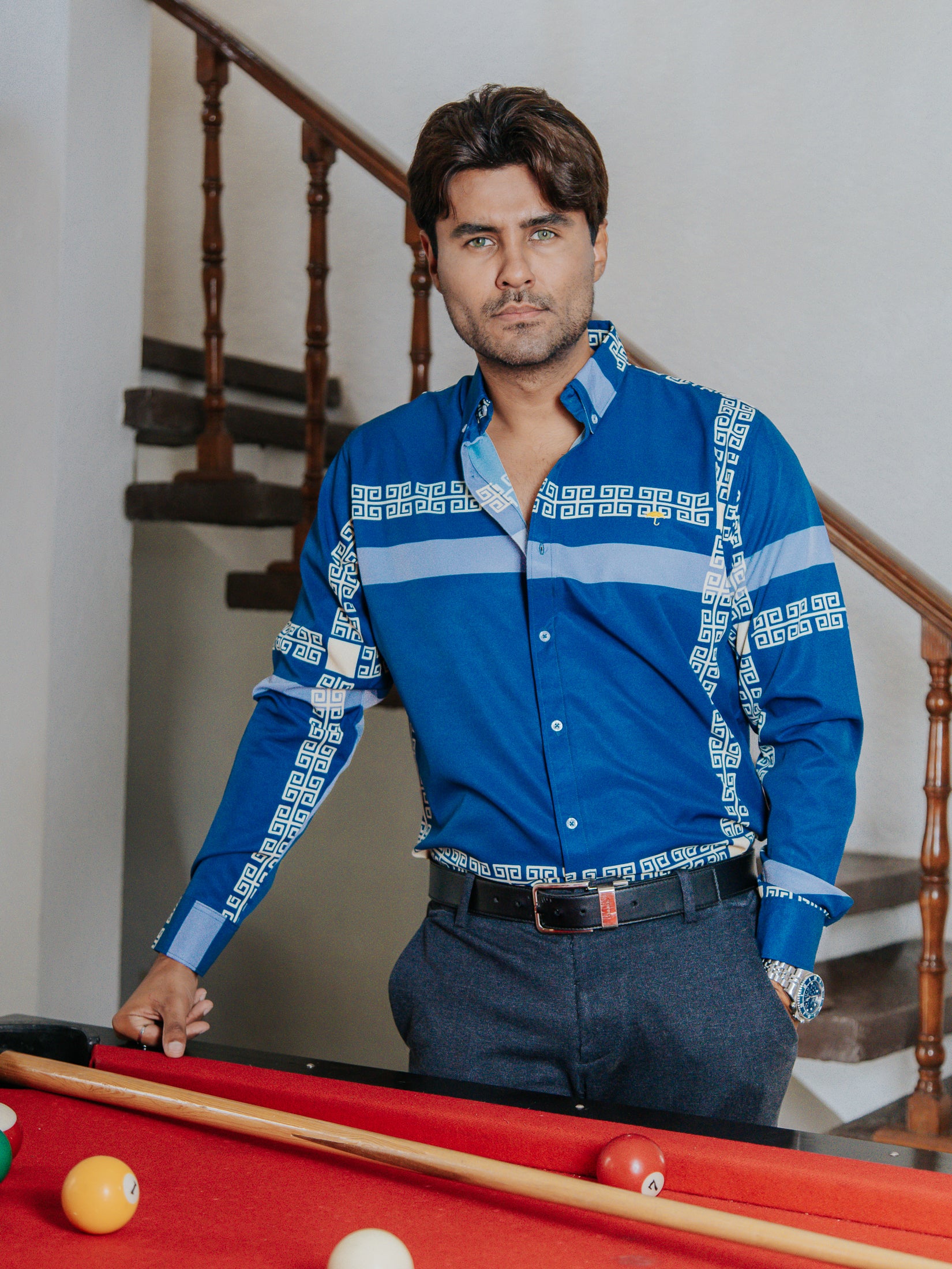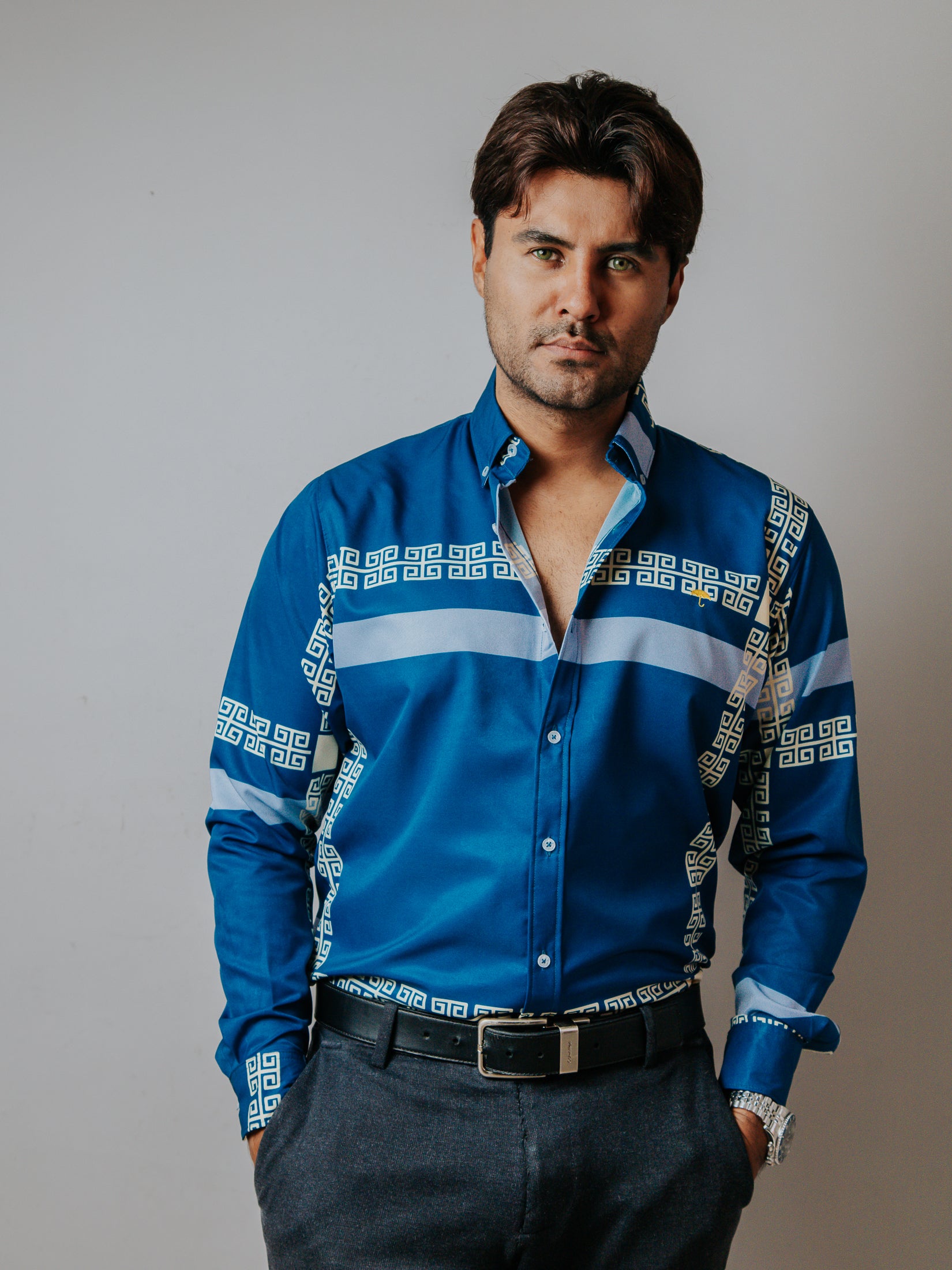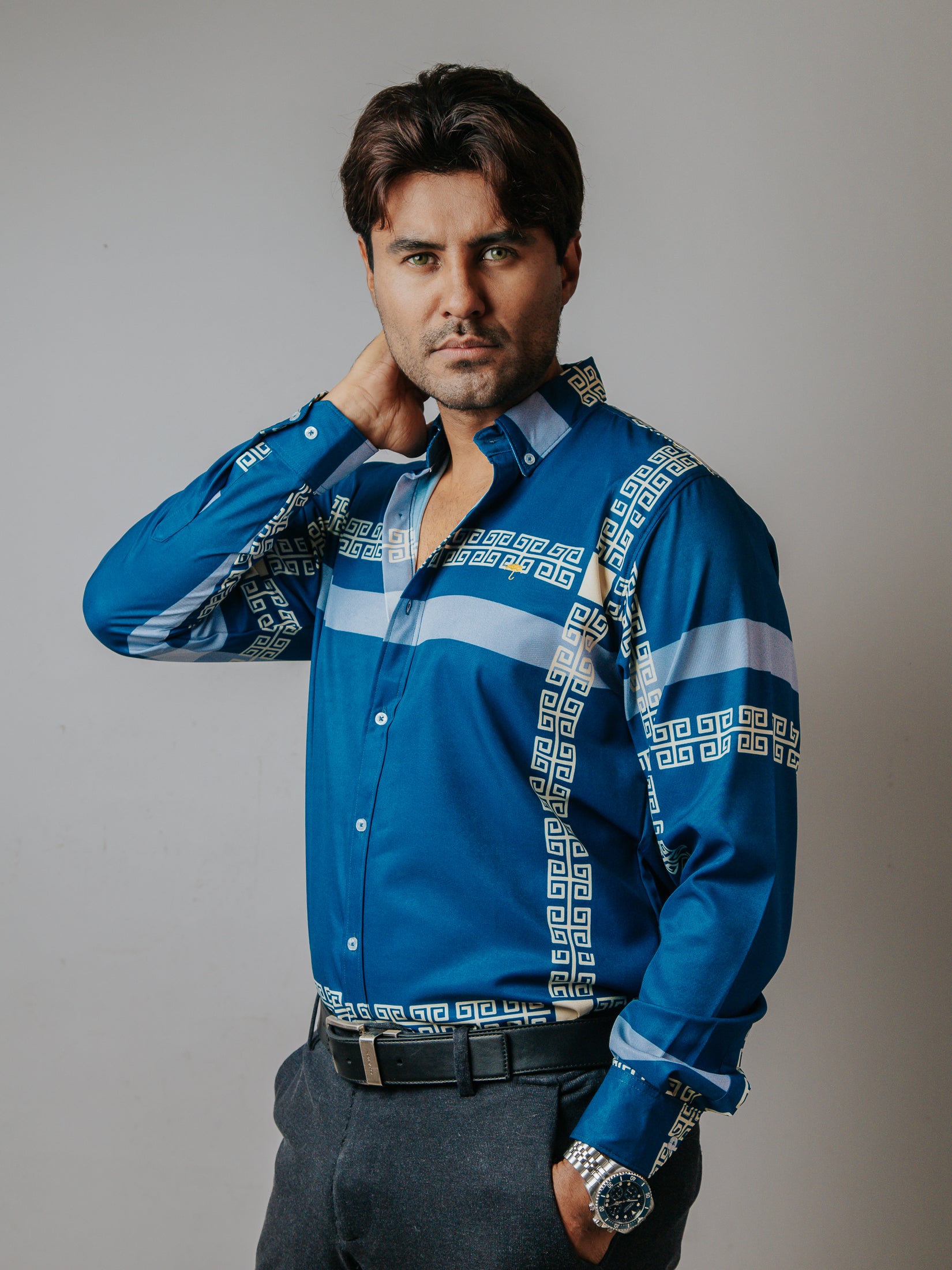 CAMISA SLIM FIT, AZUL DETALLE GRIEGO CREMA