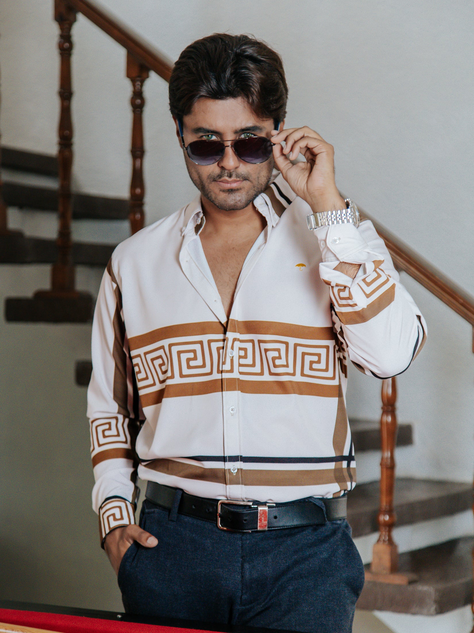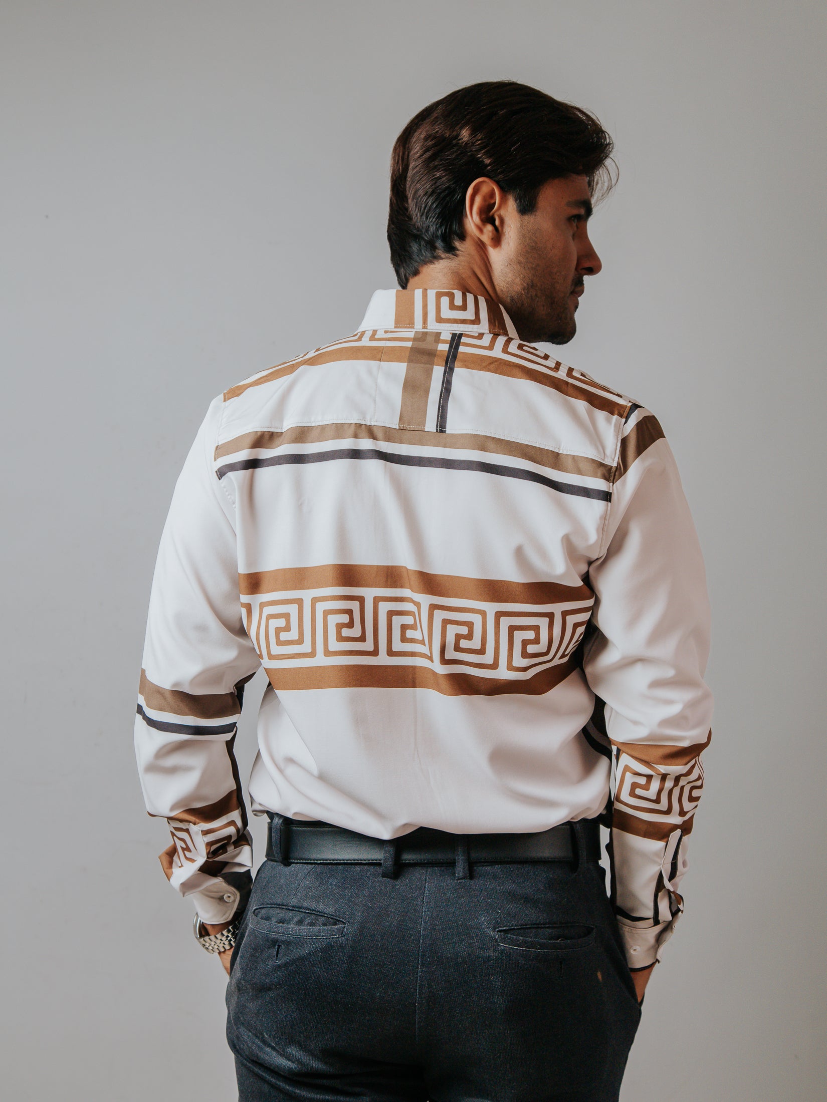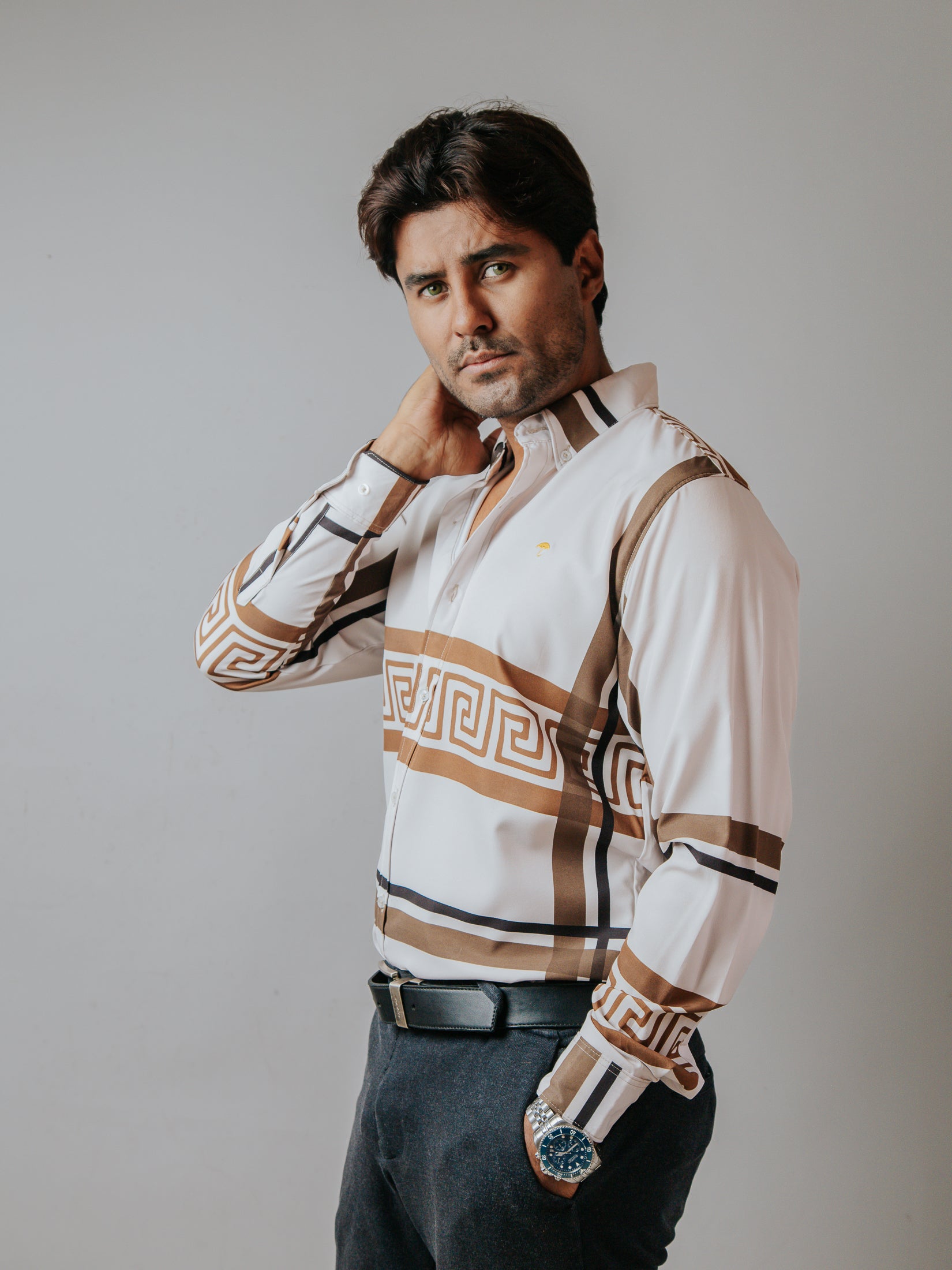 CAMISA SLIM FIT, BEIGE CLARO DETALLE GRIEGO MARRÓN