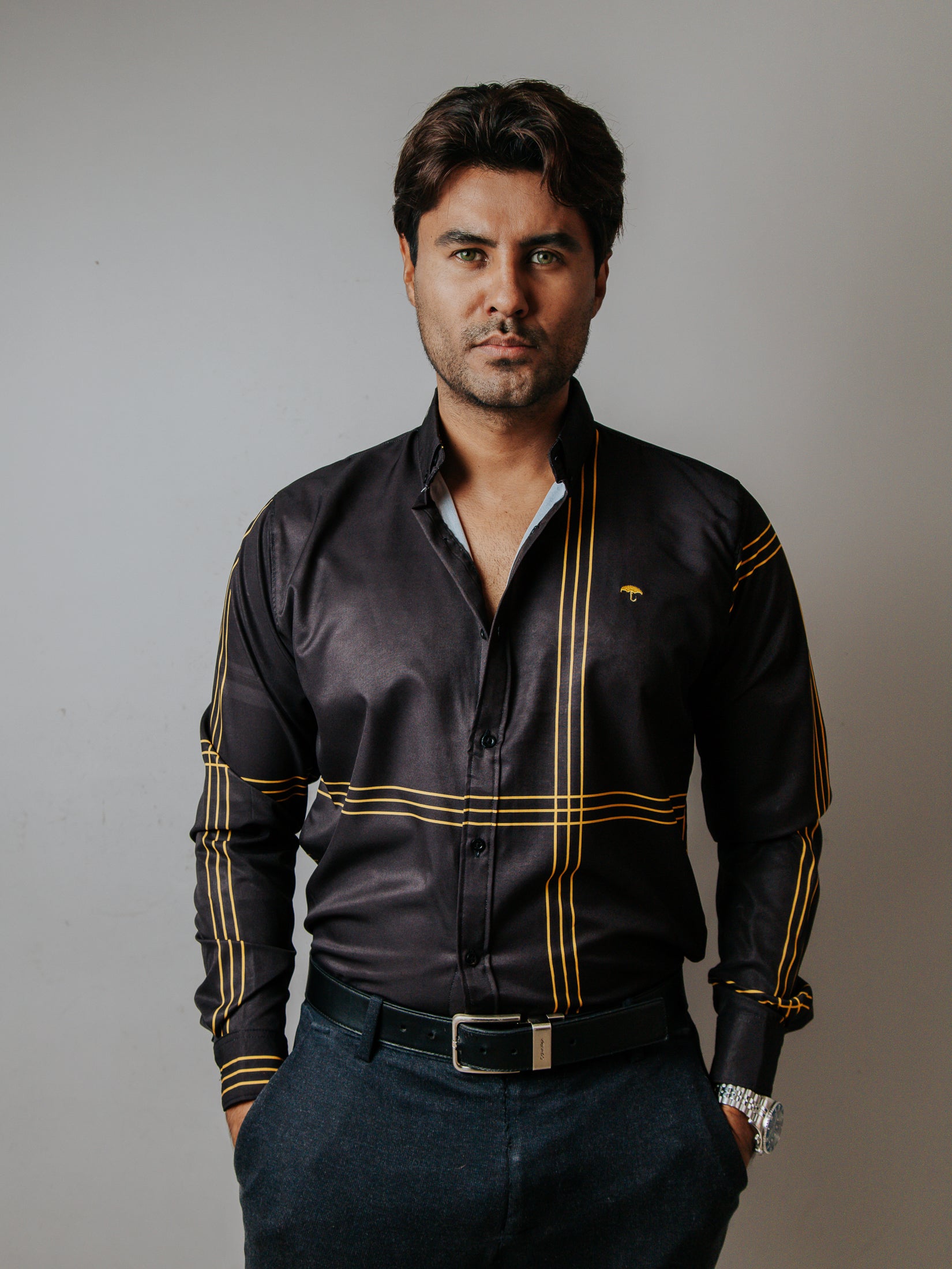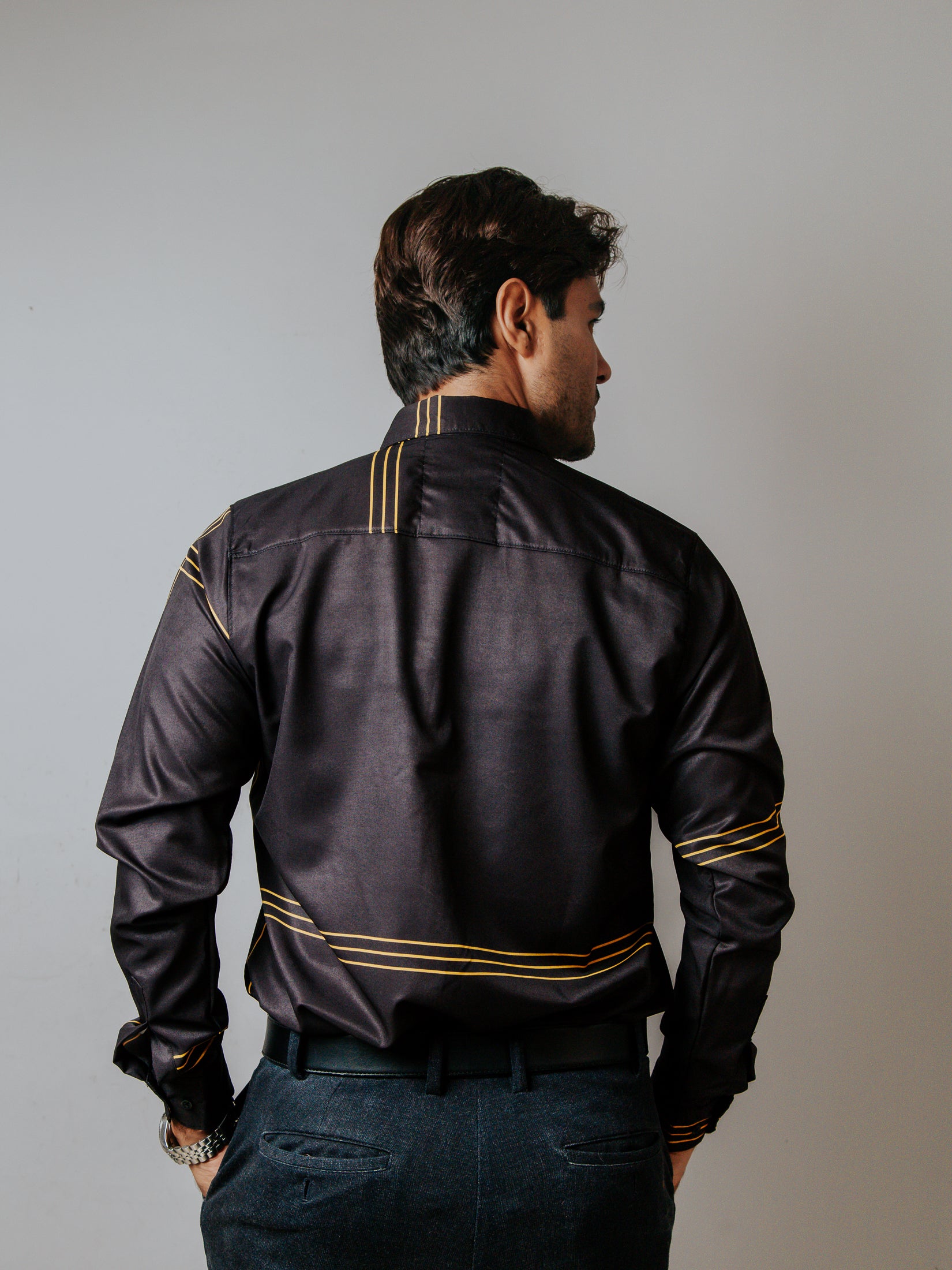 CAMISA SLIM FIT, NEGRA LÍNEAS DORADAS