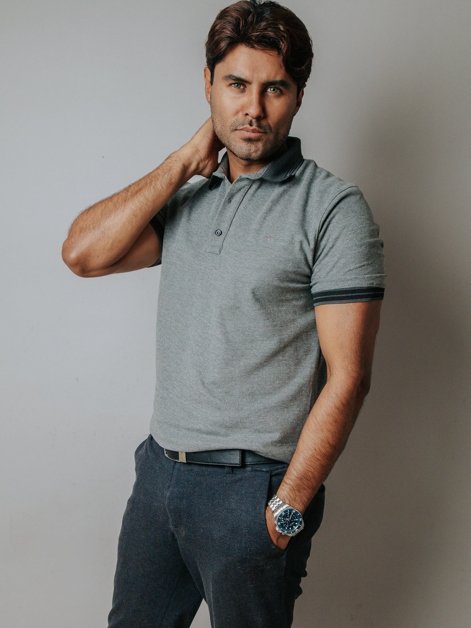 PLAYERA POLO SLIM FIT, GRIS DETALLE NEGRO